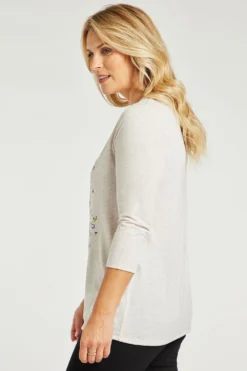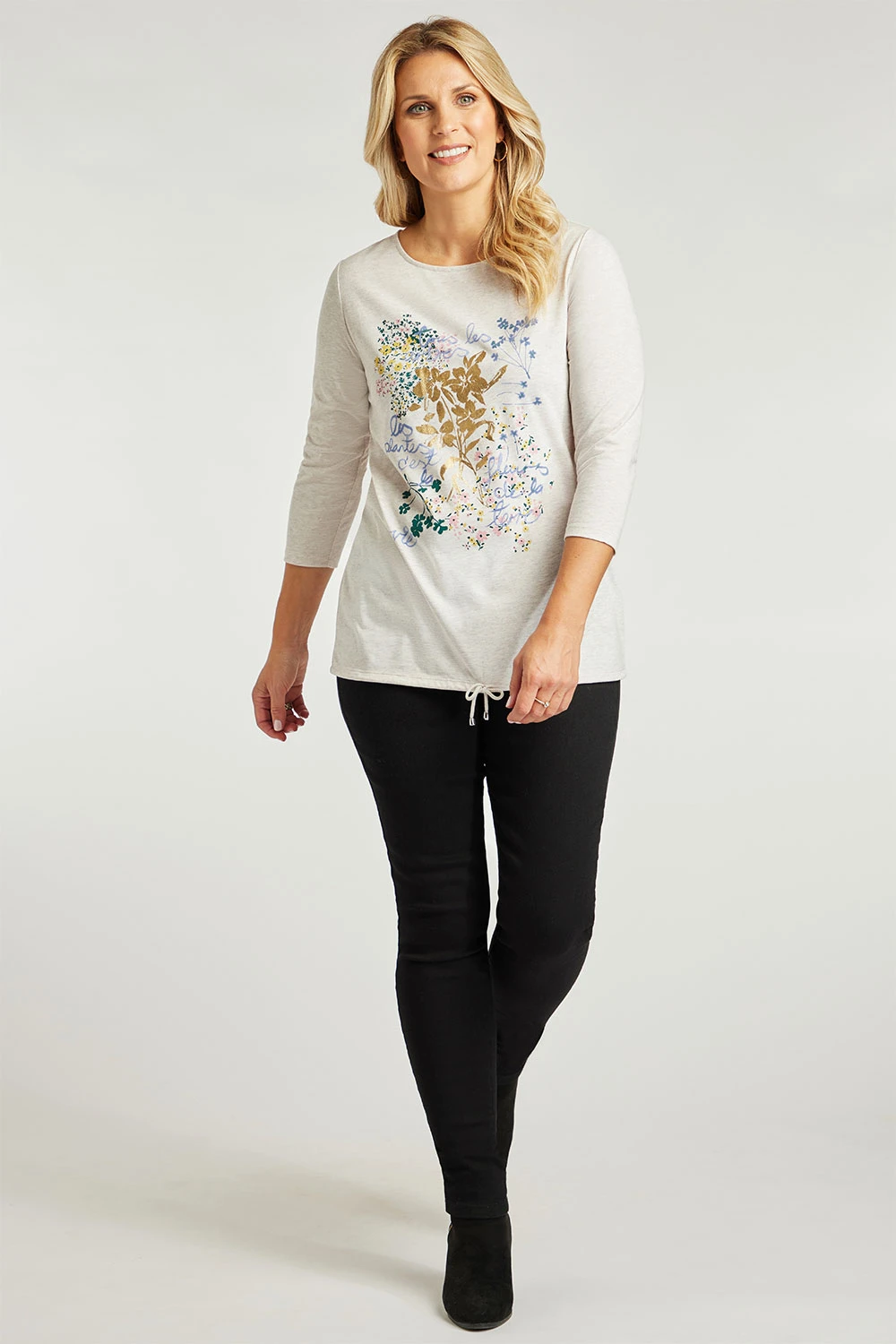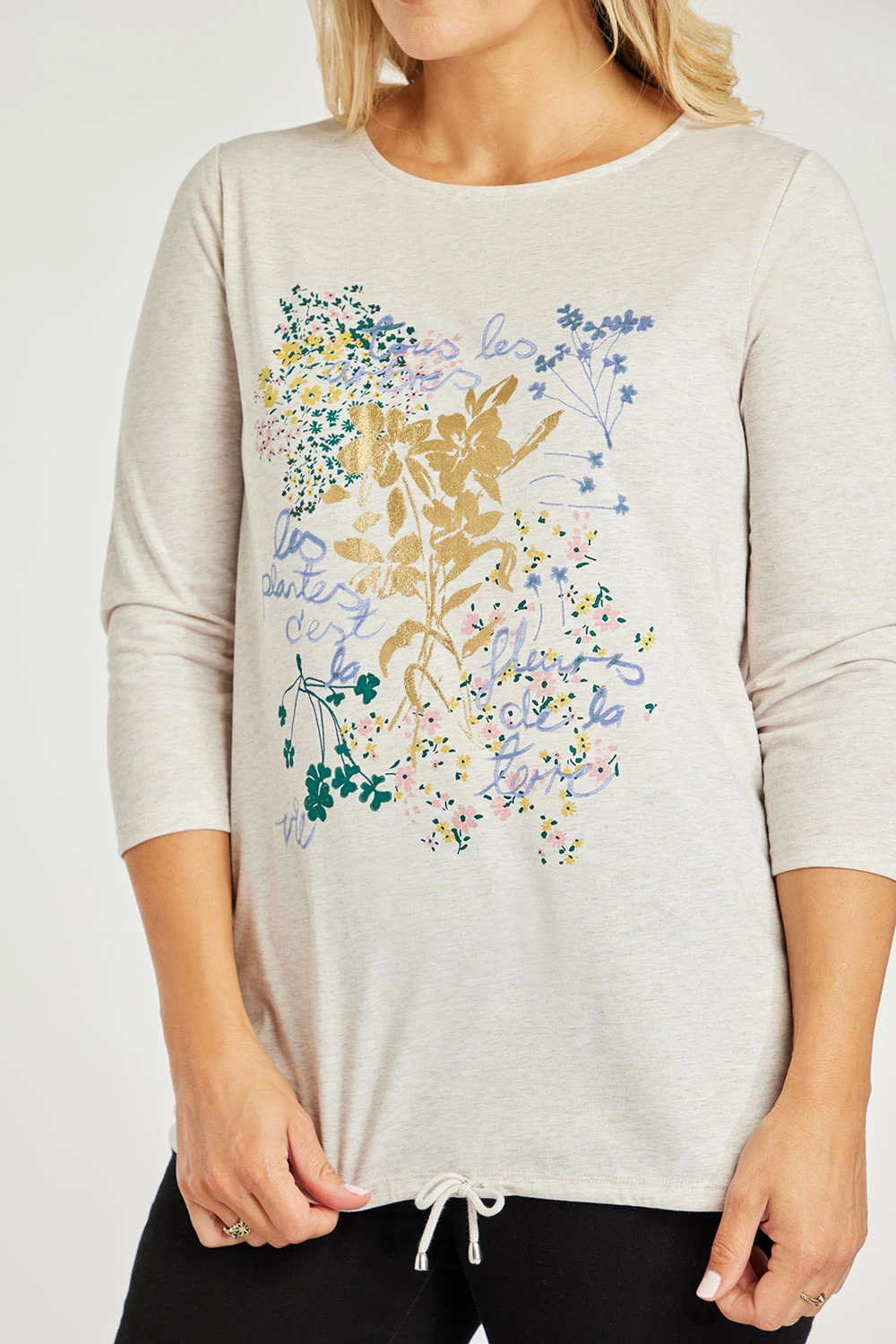 This fleur print top is a great leisurewear must-have. The scoop neck and 3/4 sleeve for added comfort. Pair with leggings and trainers for the perfect casual outfit.
