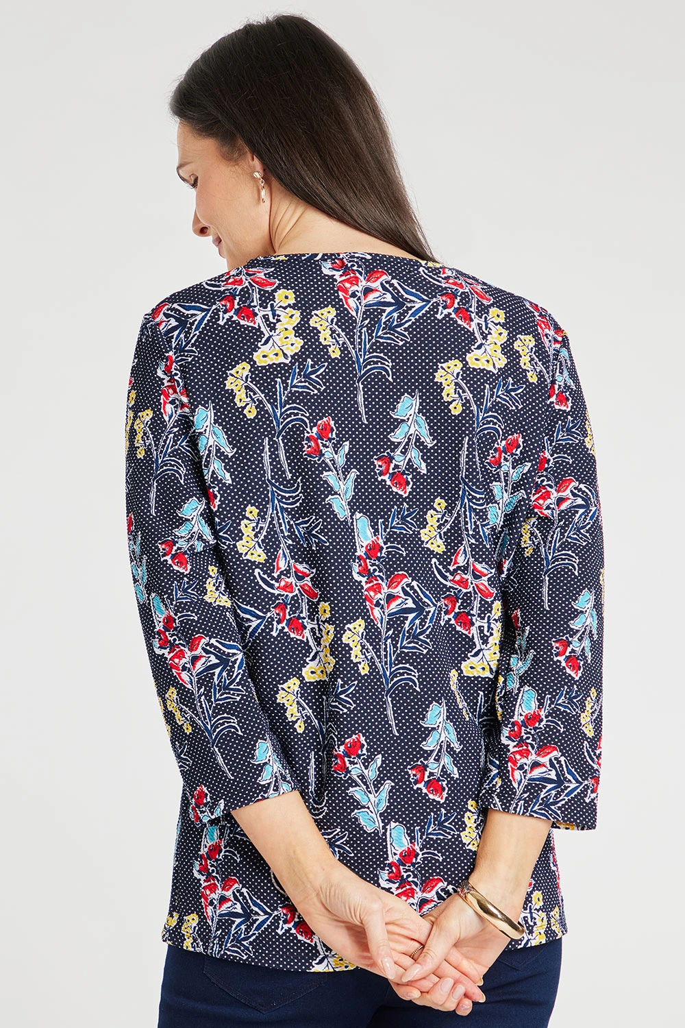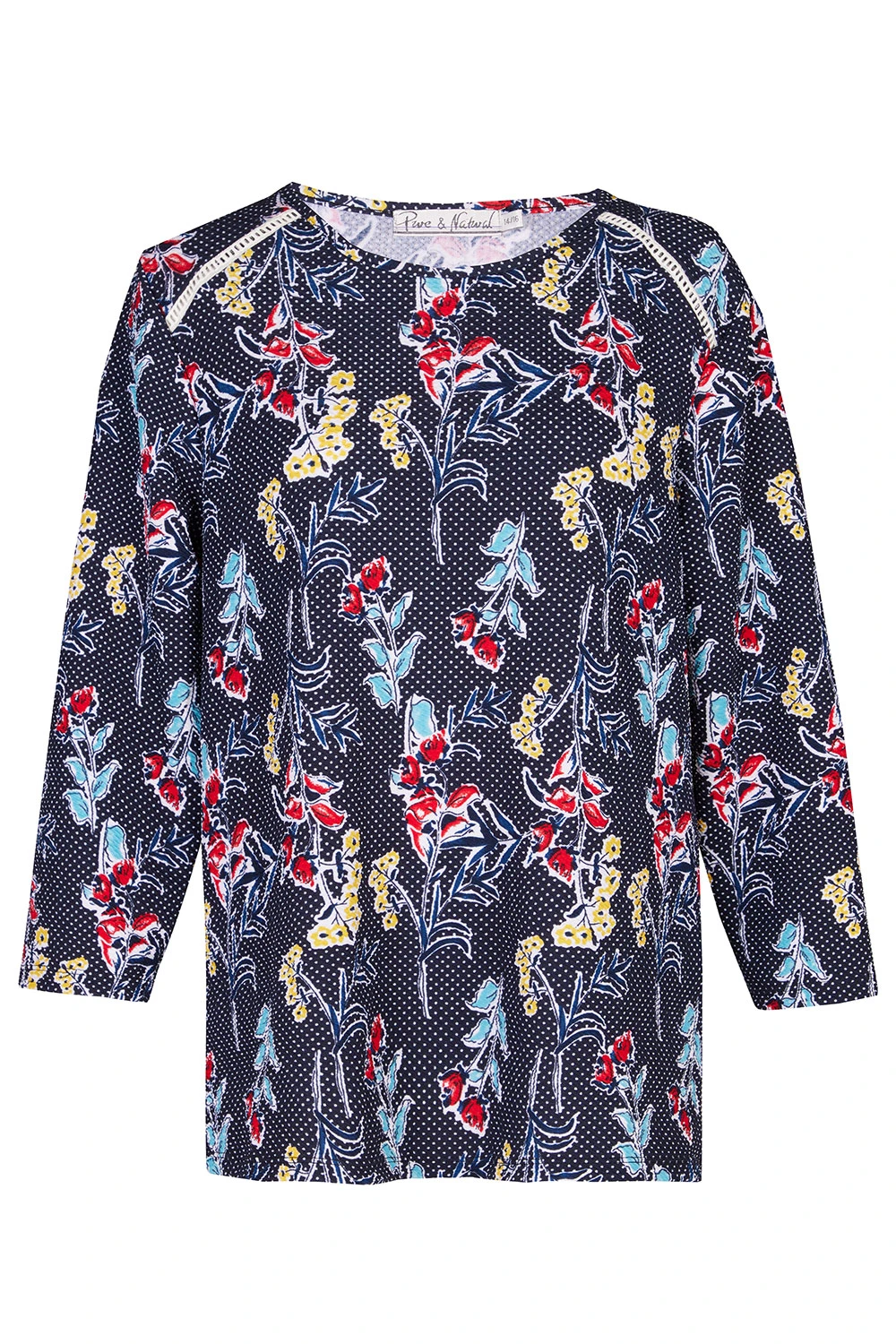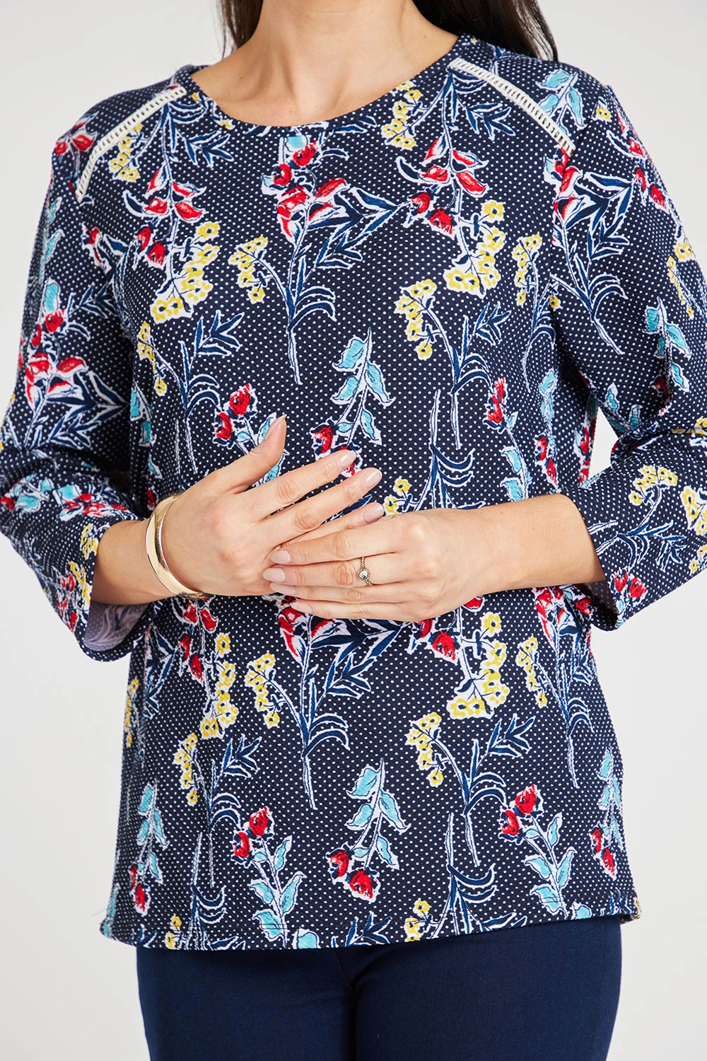 Add this beautifully designed floral top to your Spring collection this year. The stand out colour scheme paired with the lace shoulder detail makes it a must-have. The material and 3/4 sleeves will make it more breathable and comfortable as it gets warmer. Style with jeggings and heeled boots for a smart casual look.