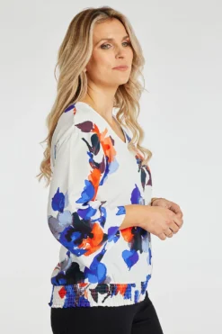 Stand out this season with this watercolour floral blouse. Perfect for a special occasion like a wedding or party. The V-neckline paired with the shirred hem makes it a must-have. Wear with trousers and heels for a smart evening look.