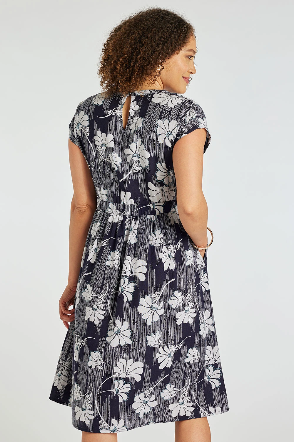 AUTONOMY | With this flattering style, this dress is sure to make the perfect addition to your collection. Featuring an all-over graphic floral print, round neckline, and short sleeves. Pair with chunky boots and a cardigan for a spring look or with a long duster coat for a winter outfit.