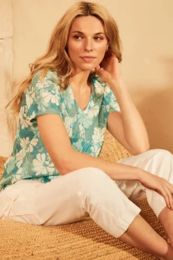 AUTONOMY | Get ready for warmer weather with this beautifully designed floral print t-shirt. The sage and white colour scheme paired with the v-neckline makes this t-shirt a must have for the Summer months. Wear it with linen shorts and sandals for a great holiday look.