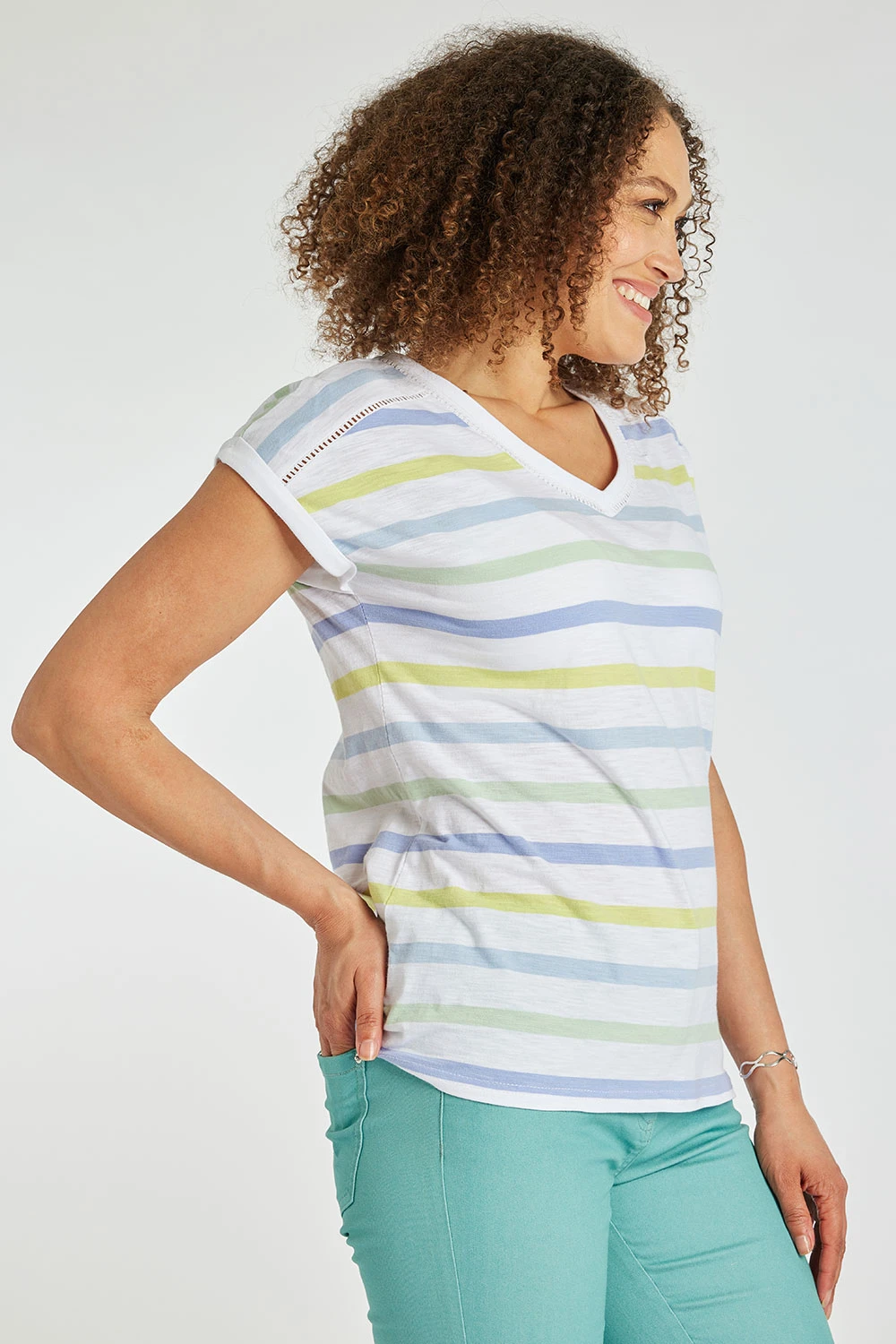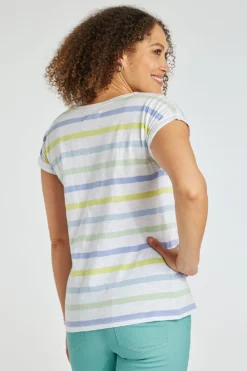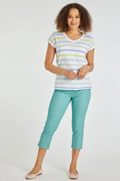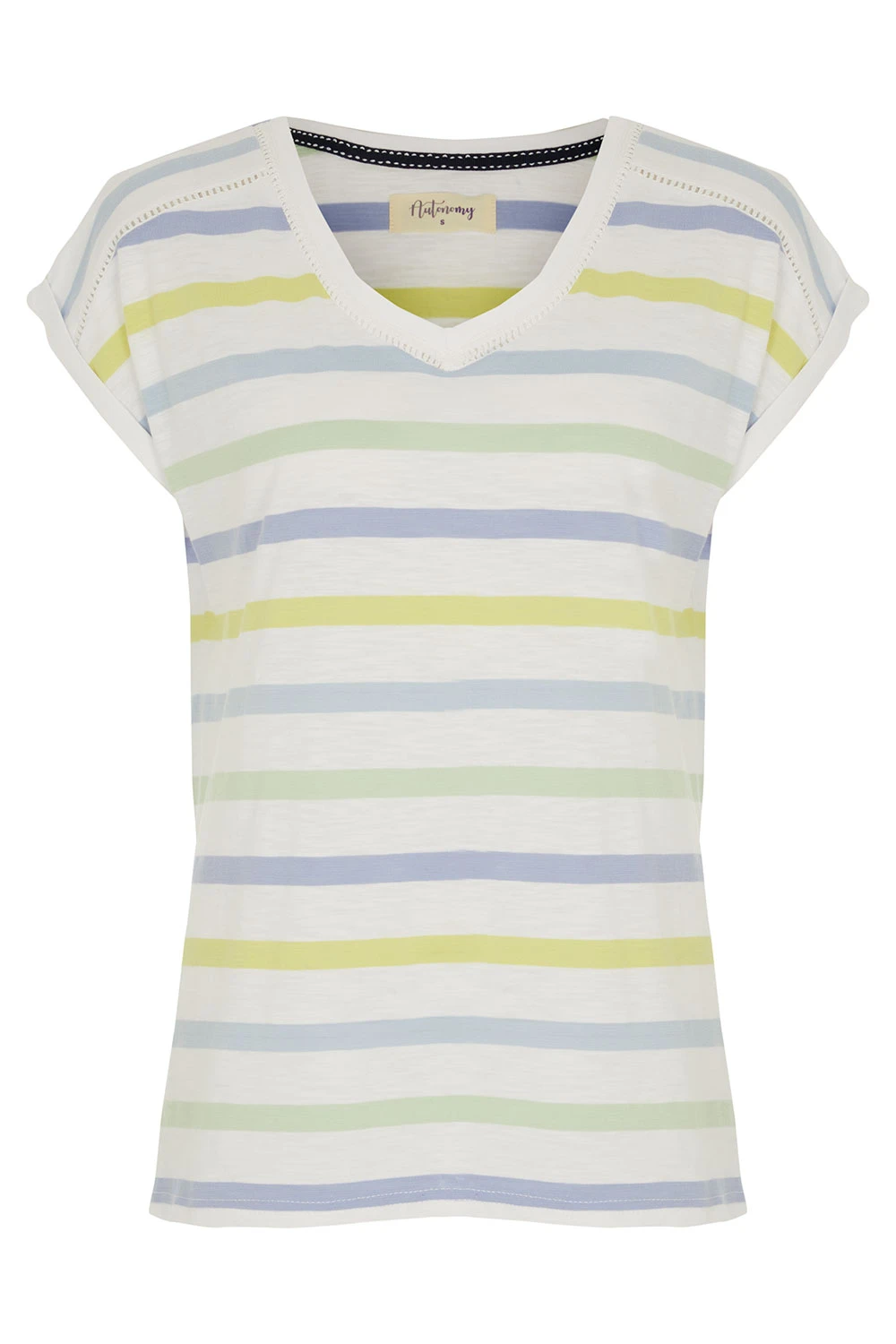 AUTONOMY | This stylish top is sure to be a staple in your new season wardrobe. It features a V neckline, striped pattern, and short sleeves. Pair with black jeans for a chic day time outfit or with linen cropped trousers for a casual weekend look.
