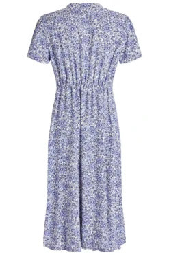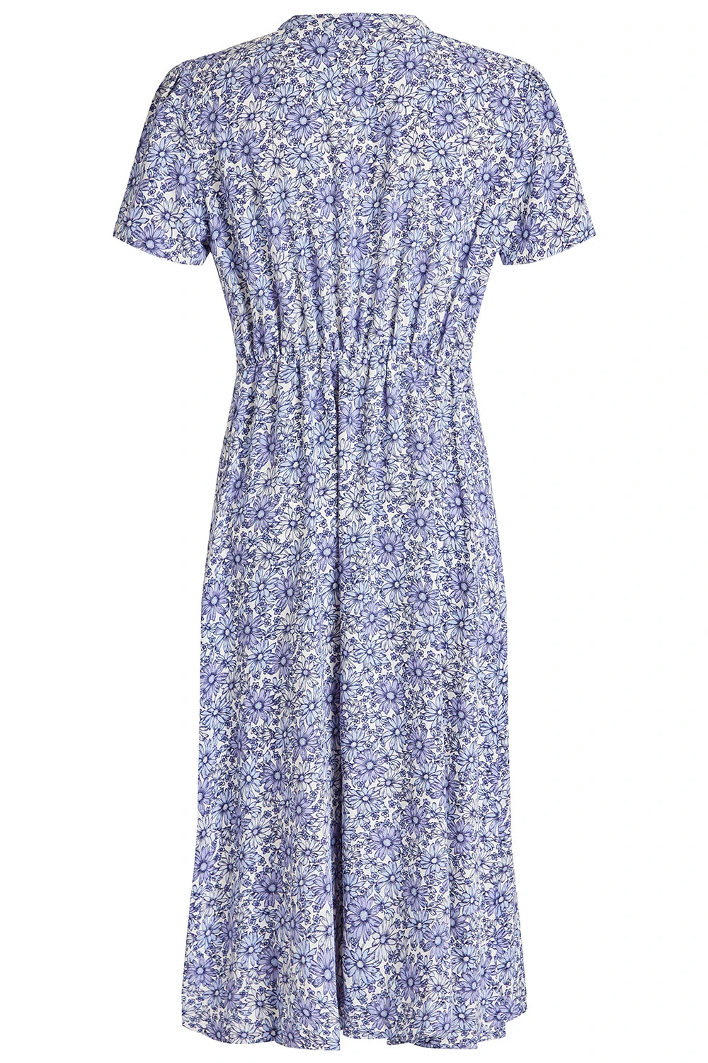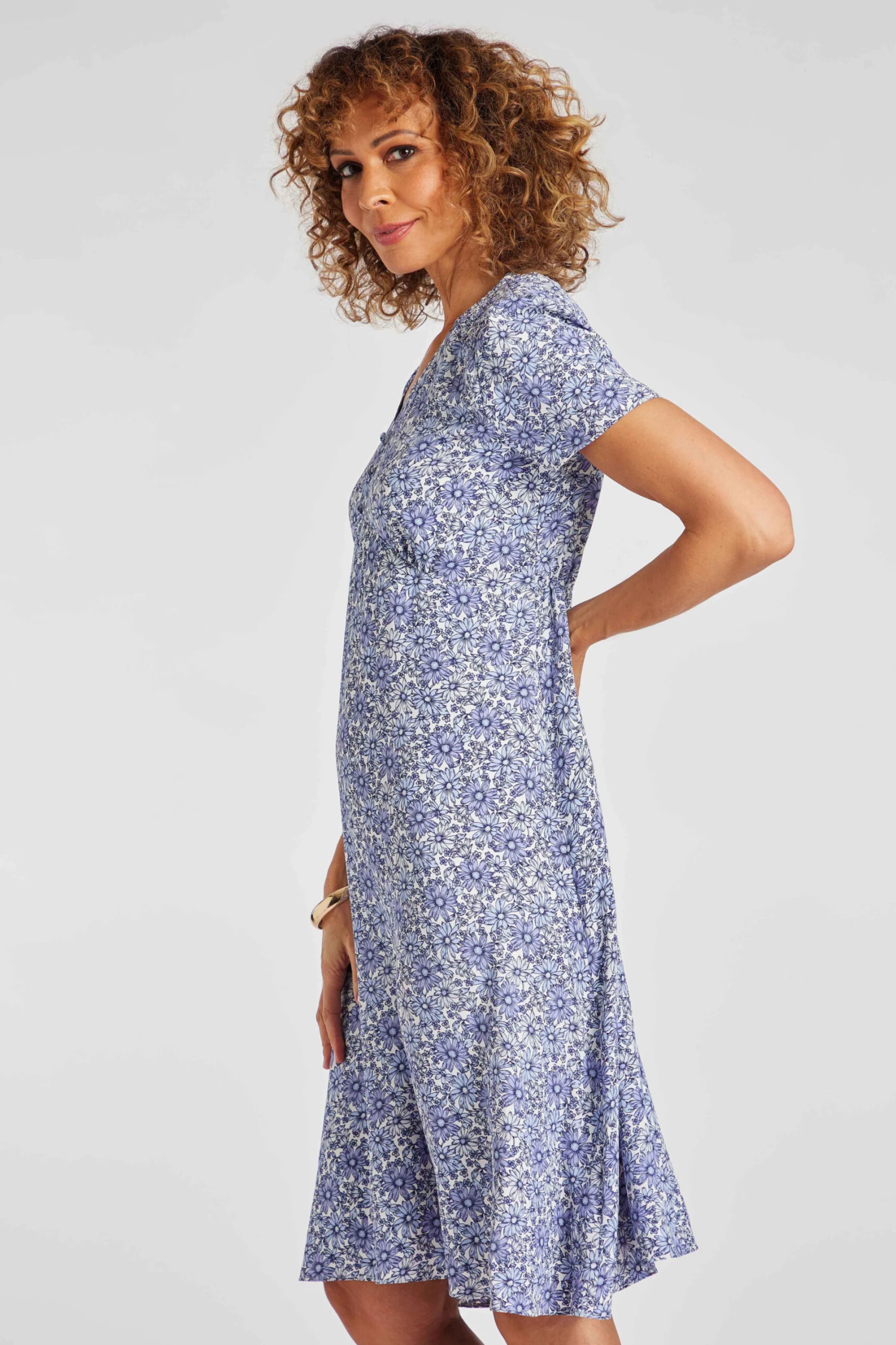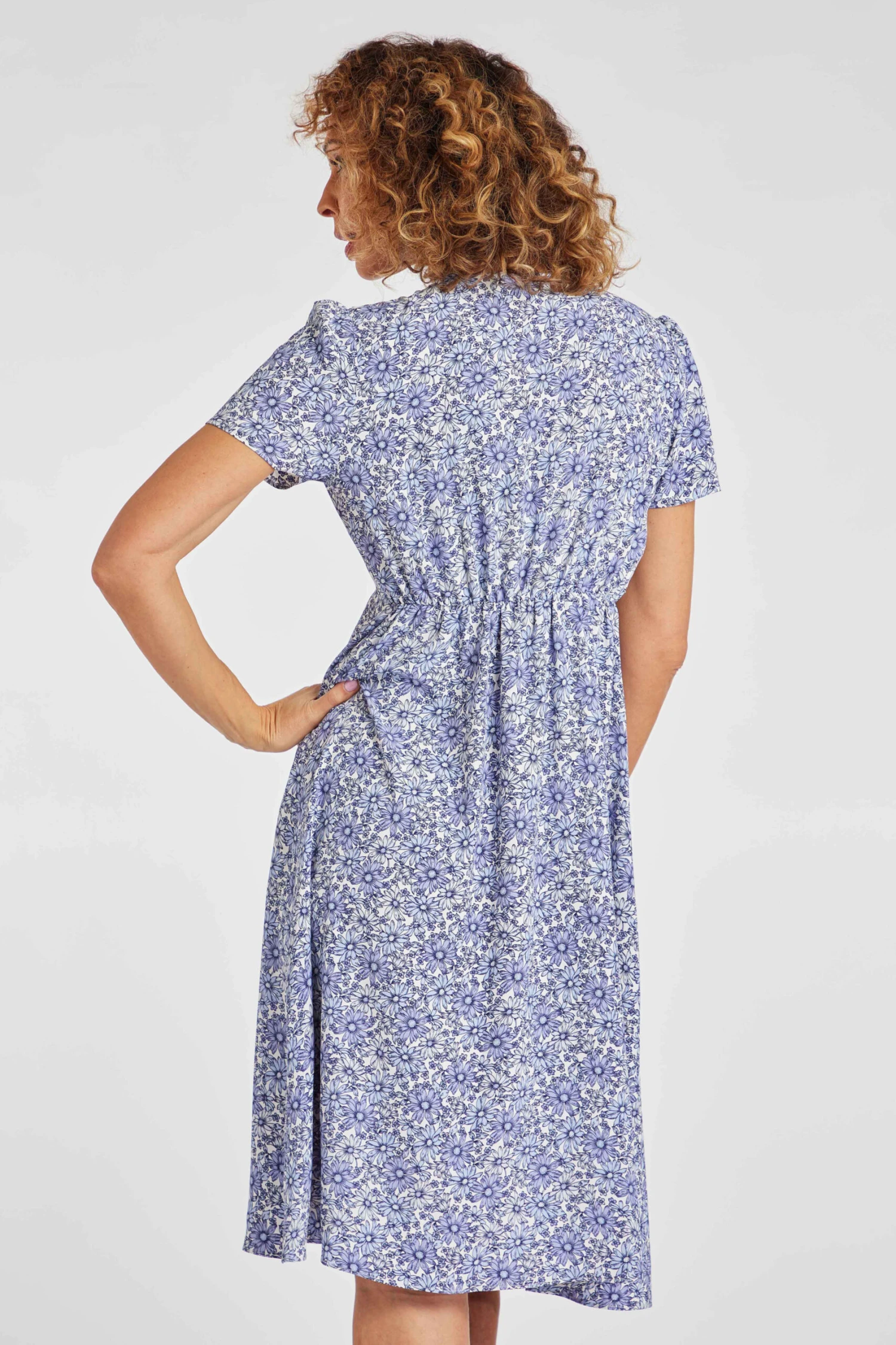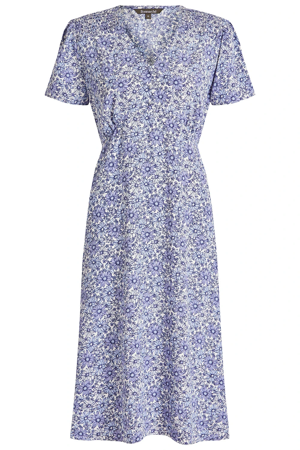 Get ready for Spring with this daisy print tea dress. Perfect for days at the park or lunch with friends. It has a shirred shoulder detail and a v-neckline. Great for a light outfit to wear when it gets warmer. Pair with sandals and a light denim jacket for a great weekend look.