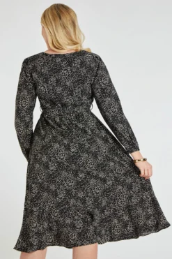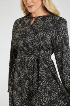 Add this beautifully designed dash print dress to your collection this Spring. Complete with a keyhole neck, dash print, and skater dress style. The long sleeves and midi length make it a must-have this season. Pair with sandals and a small bag for a great Summer look.