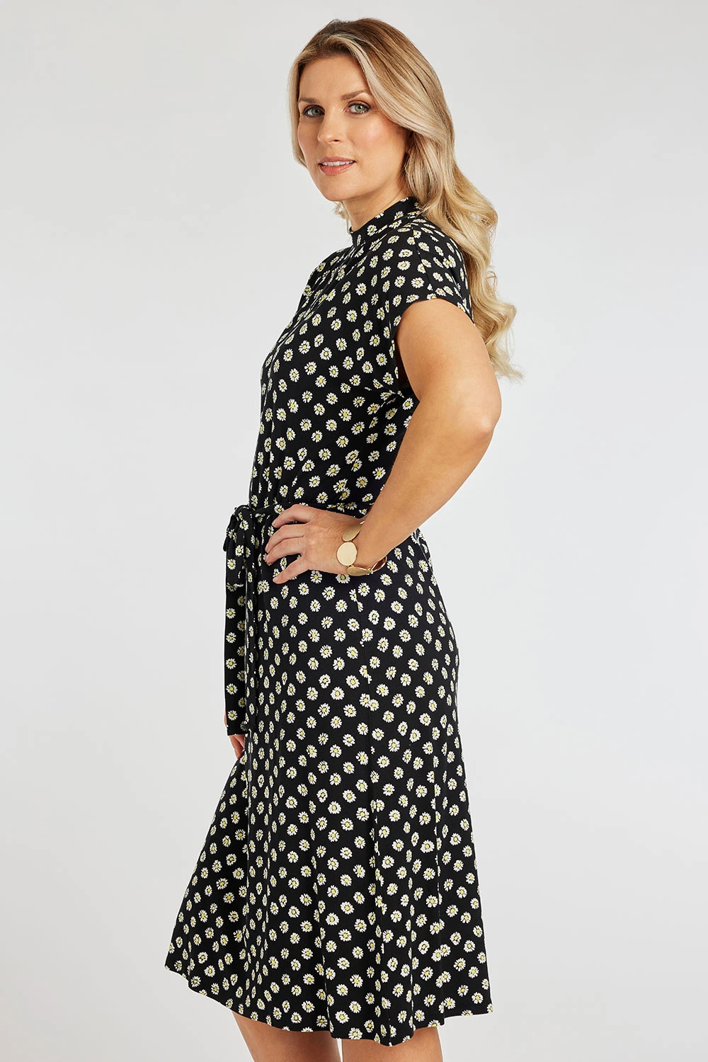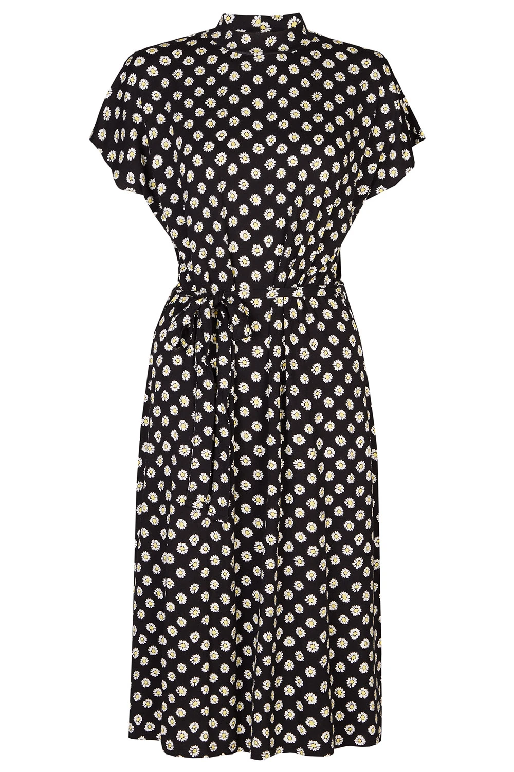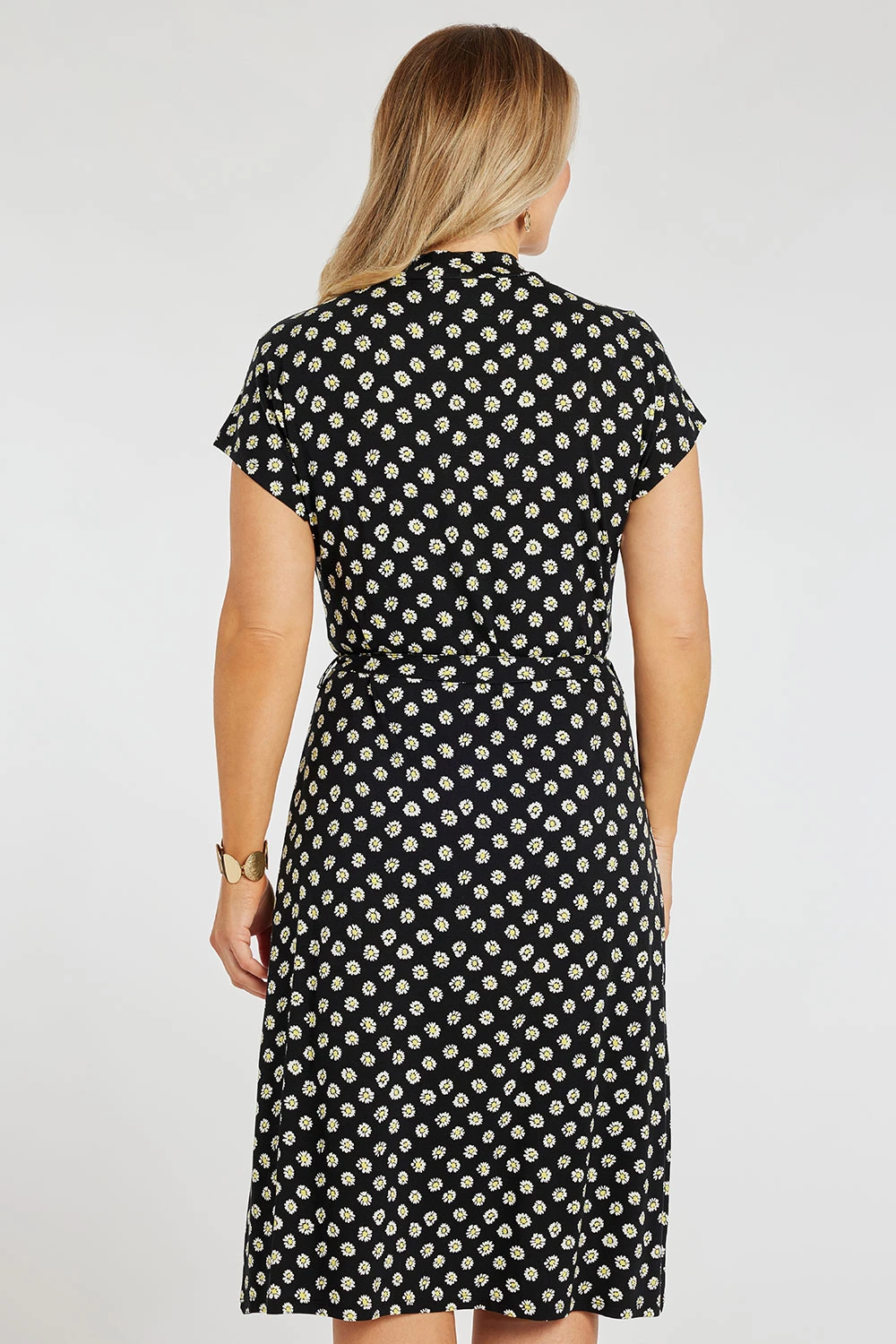 Add this beautifully designed ditsy print dress to your collection this Spring. Complete with high neck and belt detail. The short sleeves and midi length make it a must-have this season. Pair with sandals and a small bag for a great Summer look.