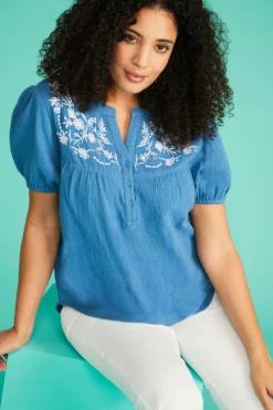 Get ready for casual Summer Sundays with this embroidered half placket shirt. Complete with short sleeves and a collarless design to keep you cool and stylish on warmer days. The embroidered pattern adds a feminine touch to the piece. Wear with linen trousers and boots for a great Summer look. And it is a part of the Lorraine Loves collection, chosen by Lorraine Kelly.
