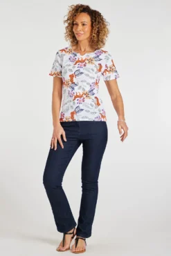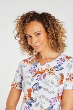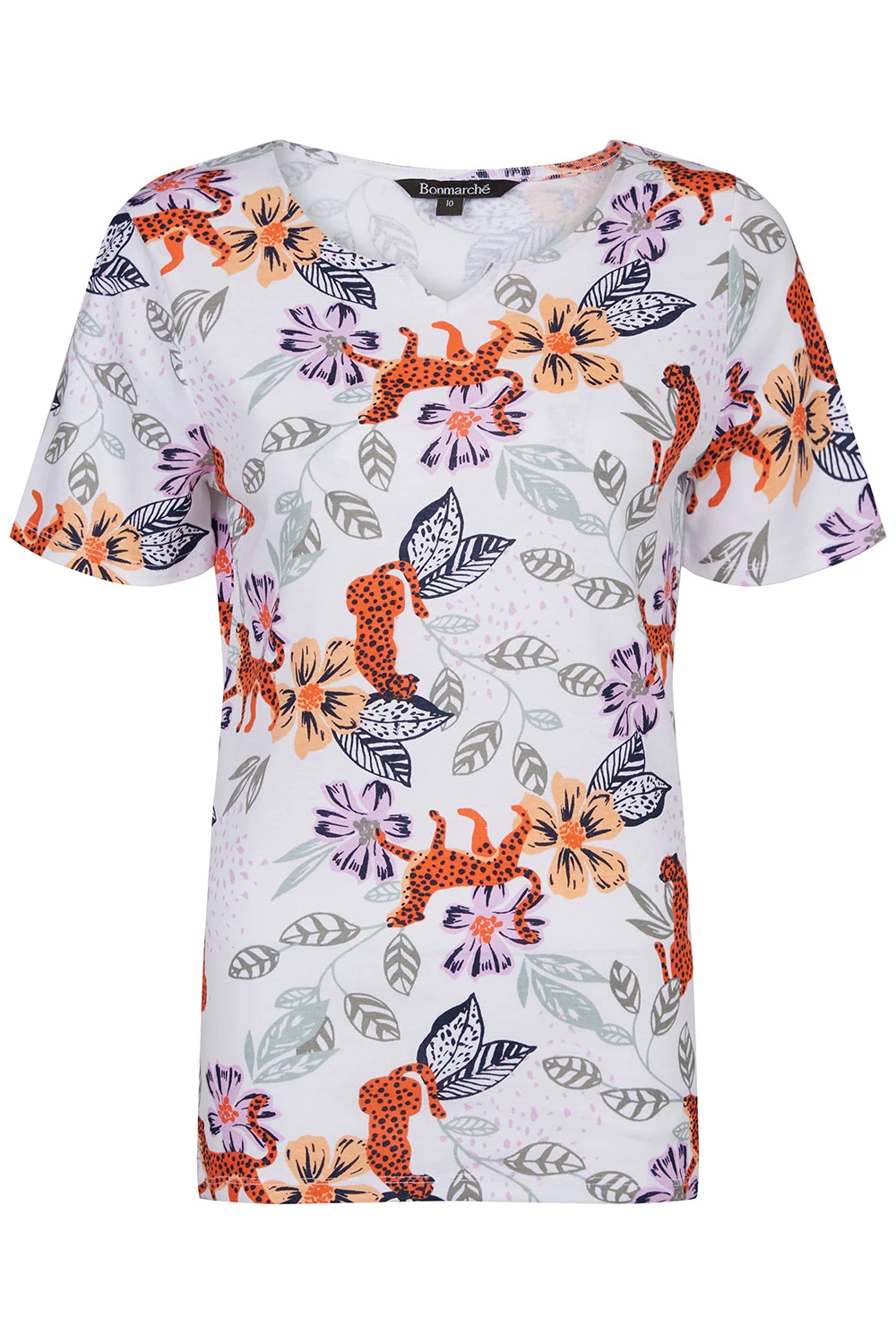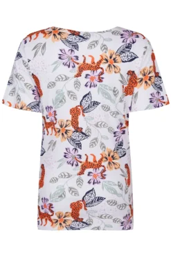 Add this floral top to your collection this Spring. The leopard print and floral design are a great twist on a classic top. Complete with short sleeves and a notch neckline makes it perfect for the warmer months ahead. Pair with white trousers and sandals for a casual summer look.