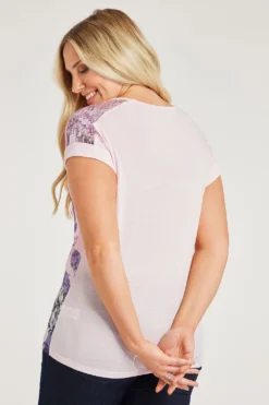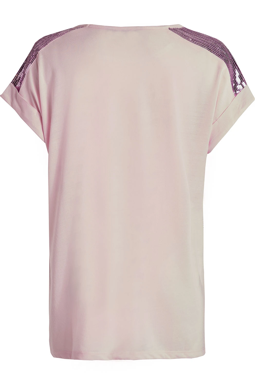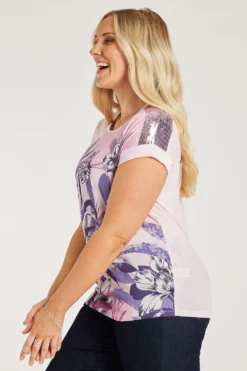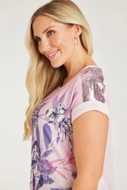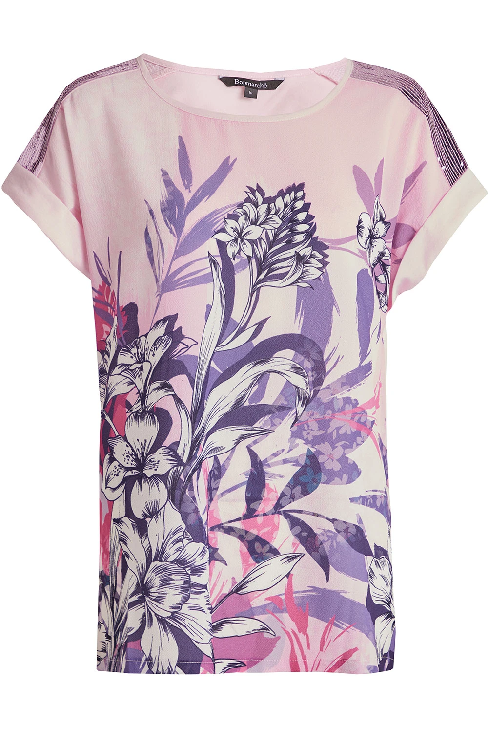 This stand-out woven front pink leaf top is a great addition to your wardrobe. A unique pick by Lorraine Kelly herself. The sequin shoulders detail and leaf design add a feminine touch and a touch of sparkle. Wear with embellished jeans and heeled boots for a nice evening outfit.