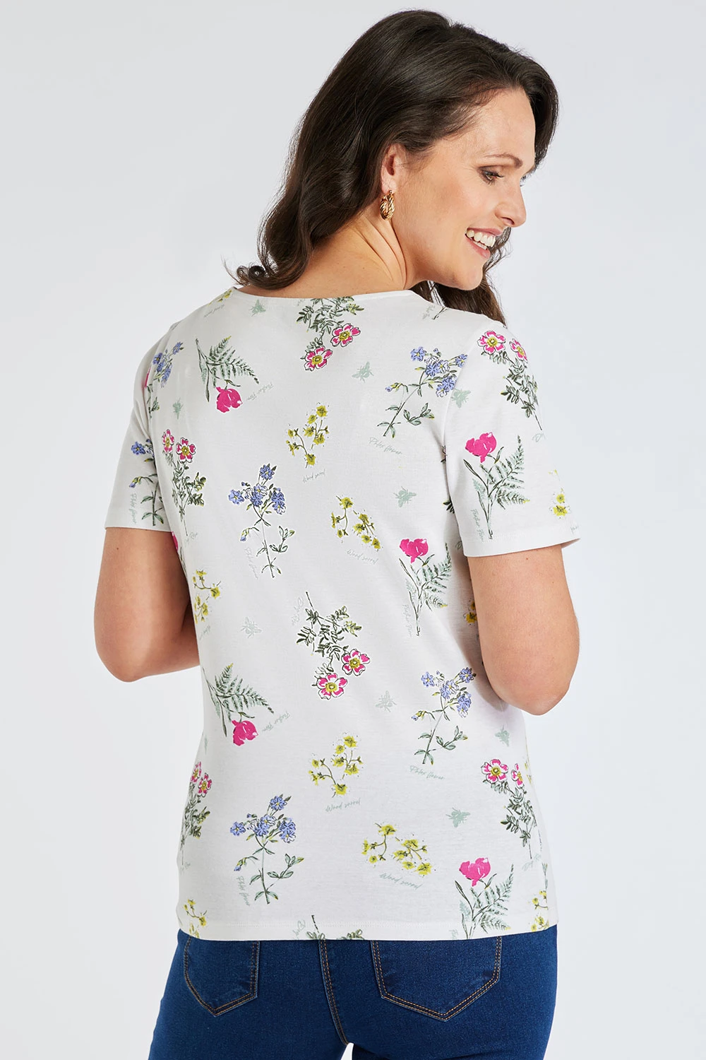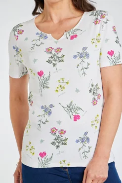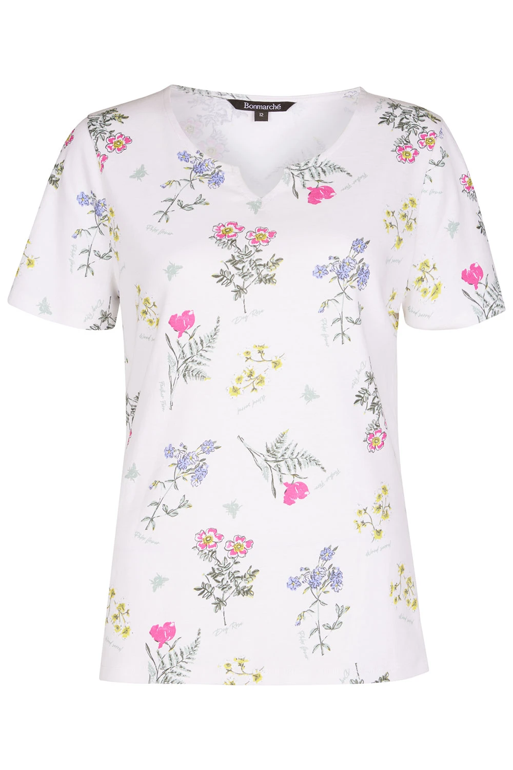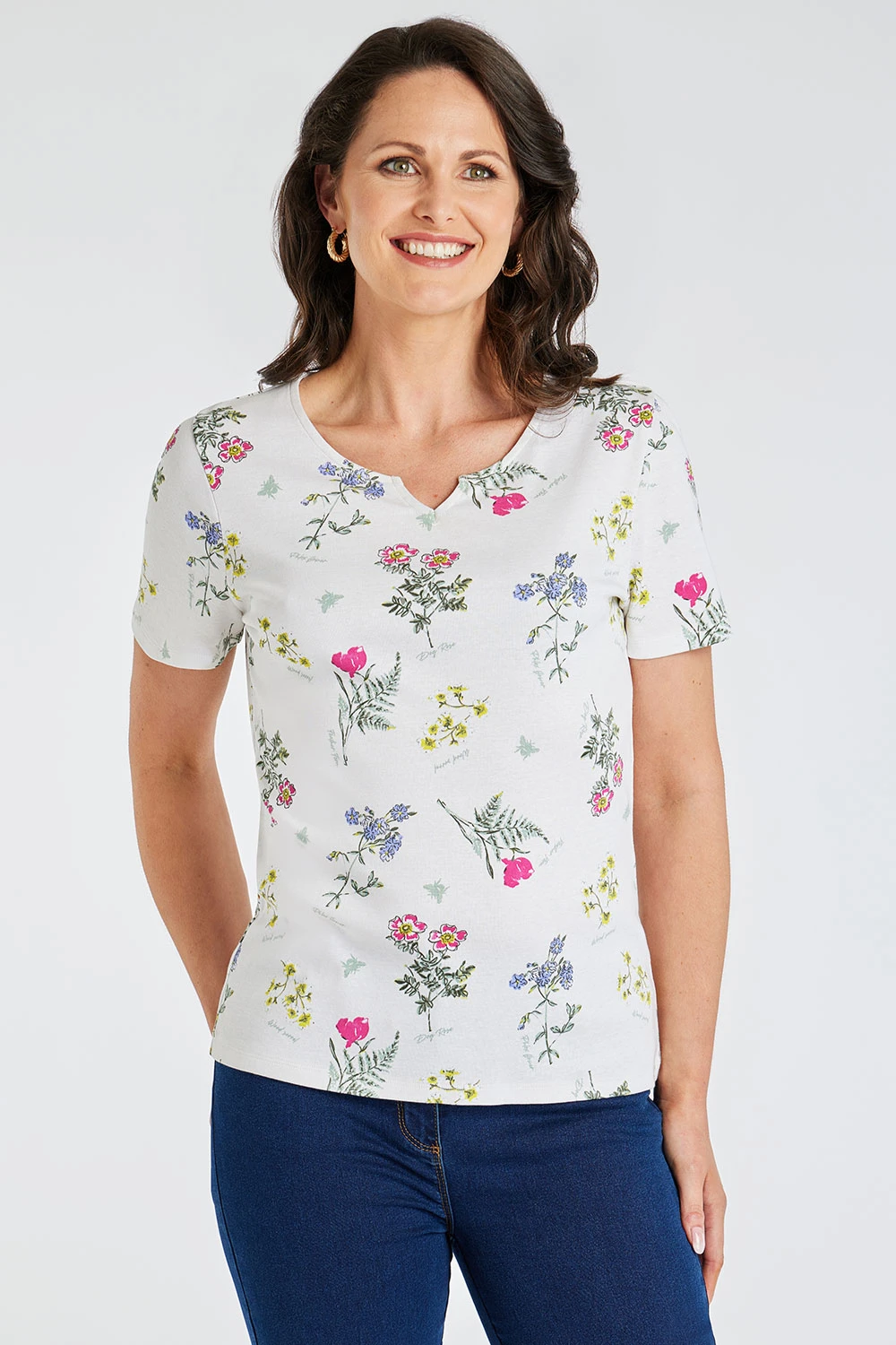 This ivory wild flower print top features short sleeves and a notch neckline; it is the perfect addition to your wardrobe. Style it with jeggings and your favourite cardigan for an effortless outfit.