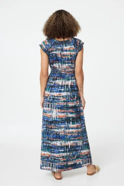 IZABEL LONDON | Add a versatile maxi dress to your wardrobe with this abstract print dress with an empire silhouette. Made from a soft jersey fabric, it has a v-neck with shirred detailing, short capped sleeves, a shirred waist and an a-line maxi length skirt. Pair with flat ballet pumps or sandals for a casual but stylish weekend look.