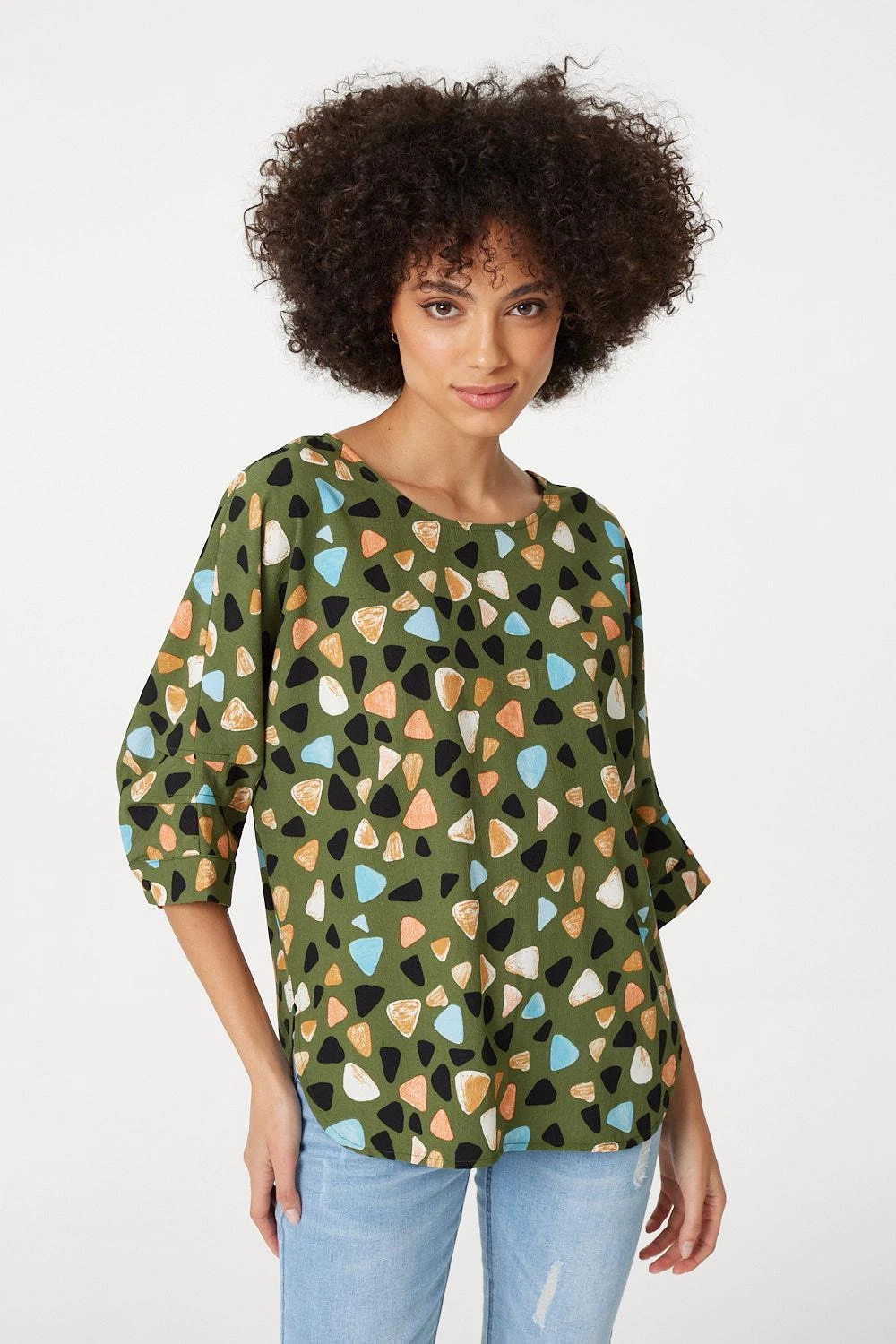 IZABEL LONDON | Add a vibrant abstract print to your wardrobe with this gathered sleeve detail blouse. It has a round neck, 3/4 sleeves, and a high low curved hem falling just below the hips. Pair with skinny jeans and fresh white trainers for an on trend weekend style.
