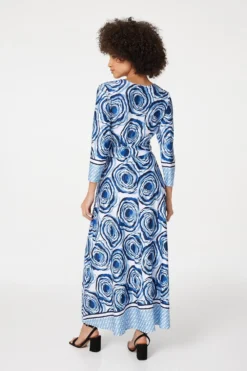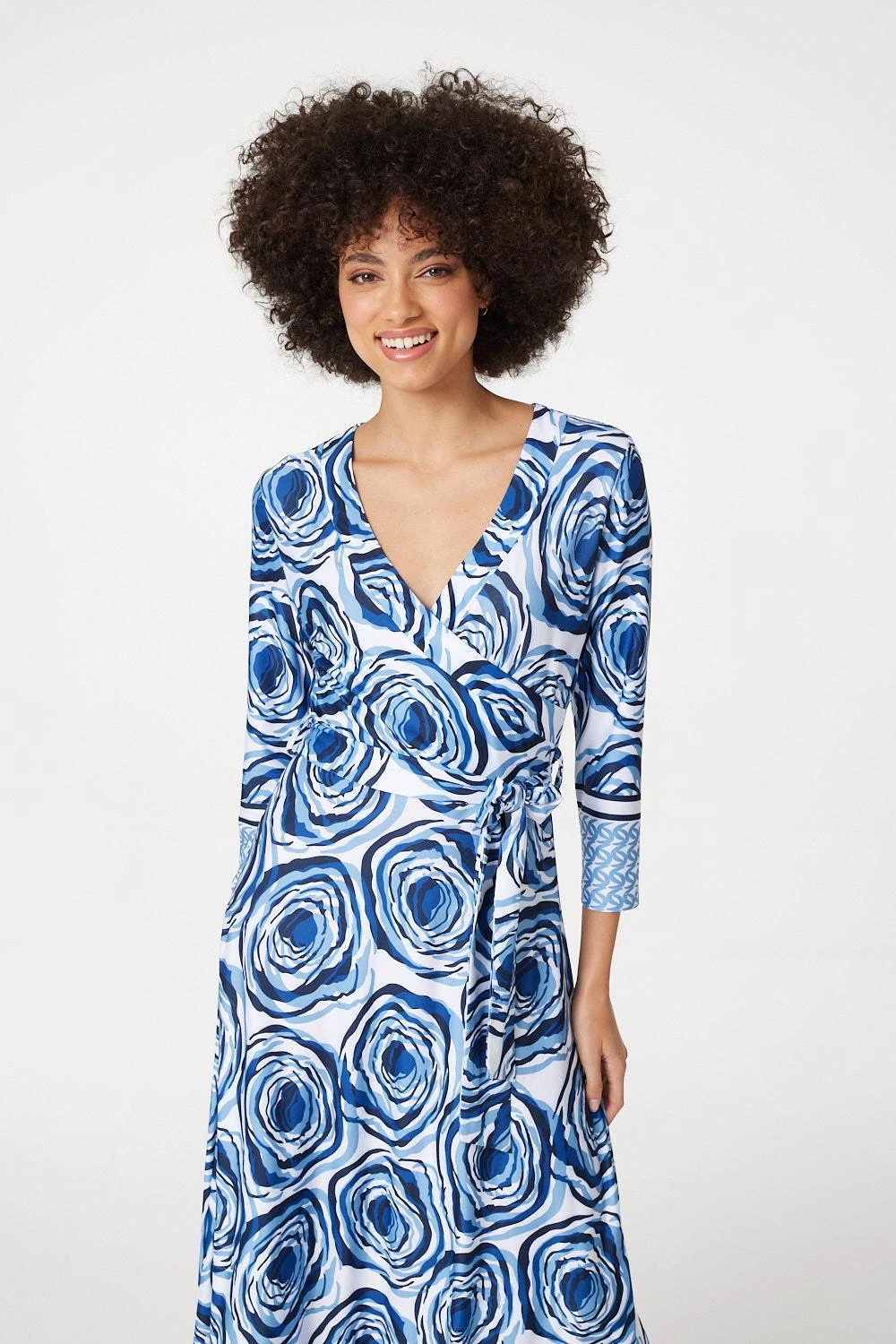 IZABEL LONDON | Add a statement print to your wardrobe with this abstract spotty print wrap dress. It has a v-neck, self-tie waist, 3/4 sleeves, and a maxi-length skirt. Pair with neutral heels or flats for a style that’s great for race day or brunch with the girls.