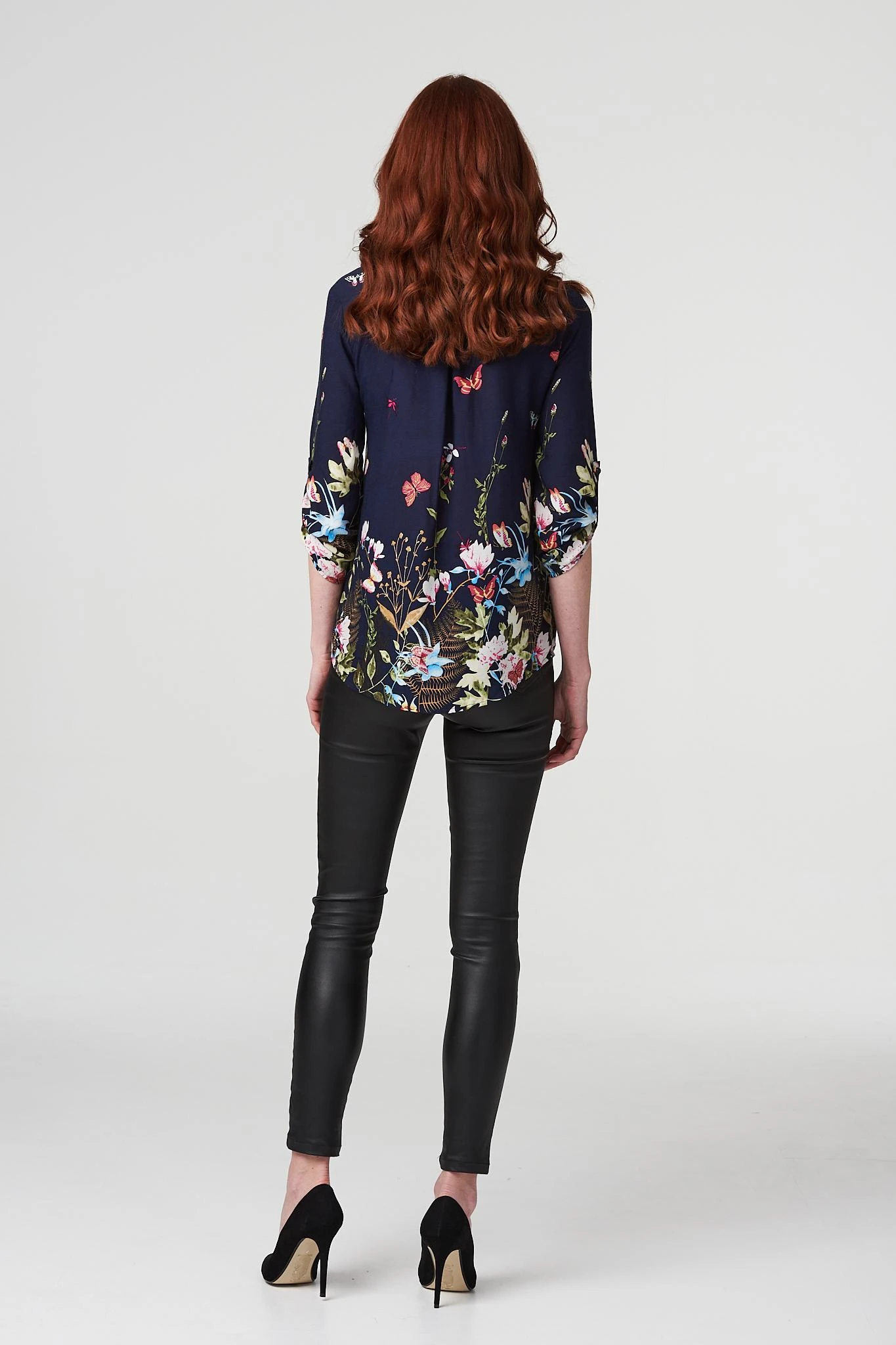 IZABEL LONDON | Add a new print to your workwear wardrobe with this floral and butterfly print shirt. It has a v-neck, long sleeves, and sits on the hips. Style with tailored trousers and low block heels for the office.
