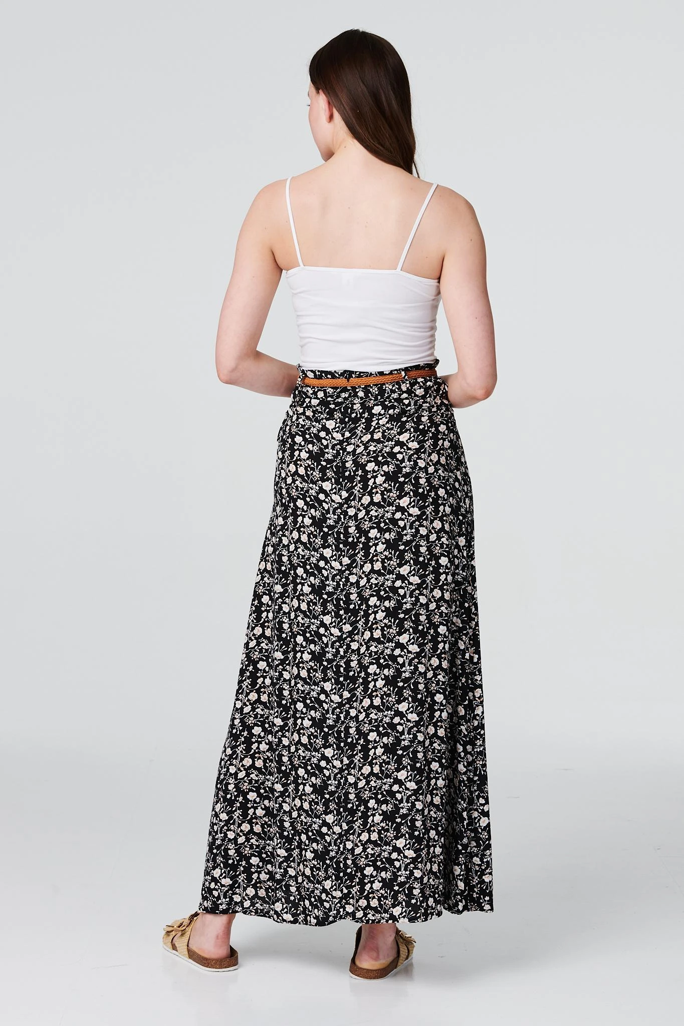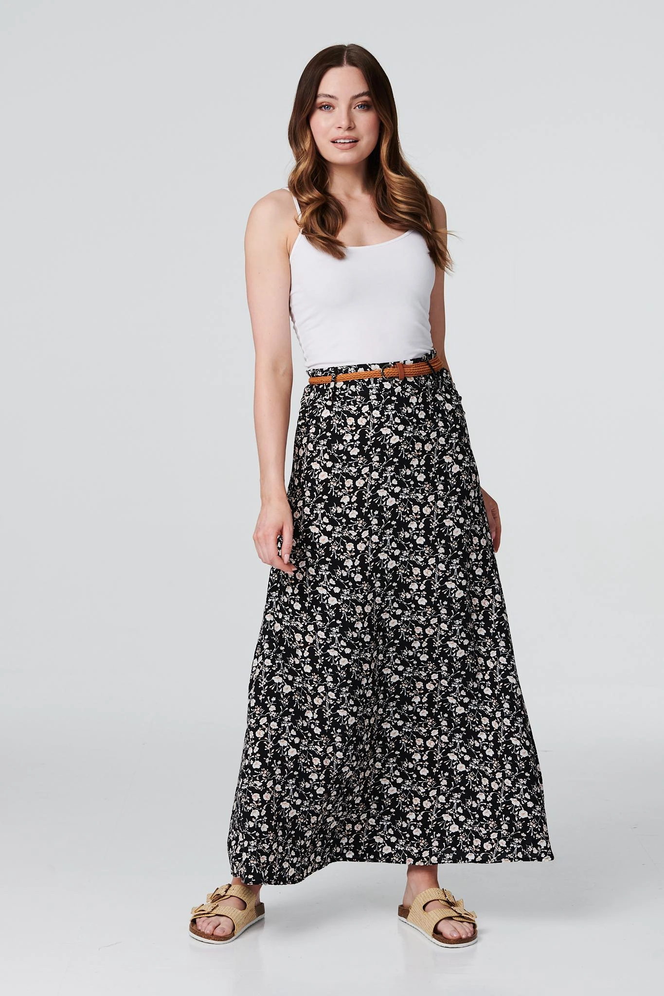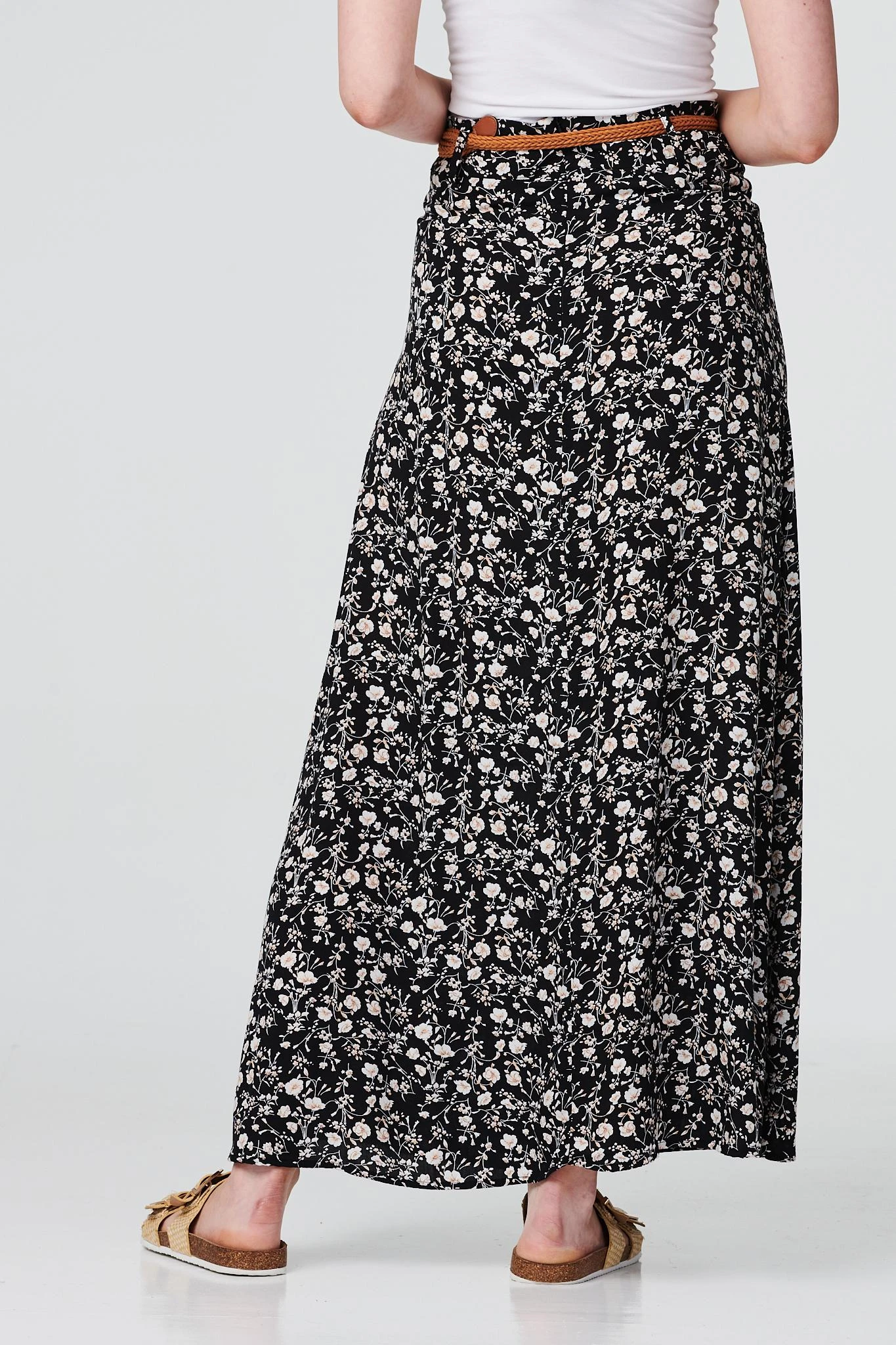 IZABEL LONDON | Add a go-to ankle length skirt to your warm weather wardrobe with this ditsy floral maxi. Made from 100% viscose, it has a removable belt, a high waist, and an A-line silhouette. Pair with fresh white trainers and a denim jacket for an elevated weekend style.