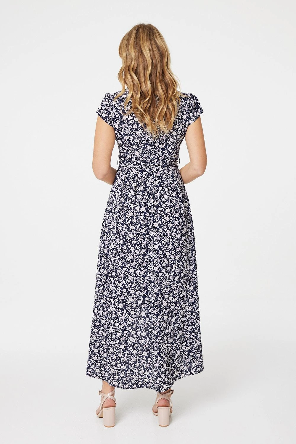 IZABEL LONDON | Add a delicate floral print to your dress collection with this ditsy floral wrap tea dress. With a v-neck, short cap sleeves, a wrap front, self tie waist, and a high low midi hemline. Team with smart heels for a look that would be perfect for lunch with friends.