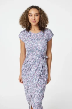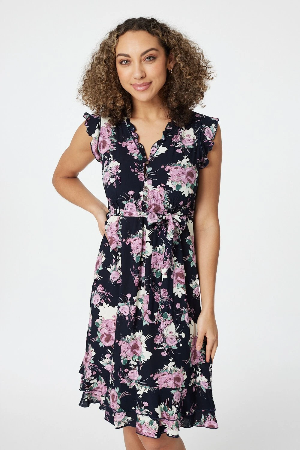 IZABEL LONDON | Add a chic floral print to your wardrobe with this midi tea dress. Made from 100% viscose, it has a v-neck with a frill trim, short frilled cap sleeves, a self tie waist, and a midi-length skirt with a pephem. Pair with fresh white trainers and layer with a denim jacket or longline cardigan for an on-trend warm weather weekend style.