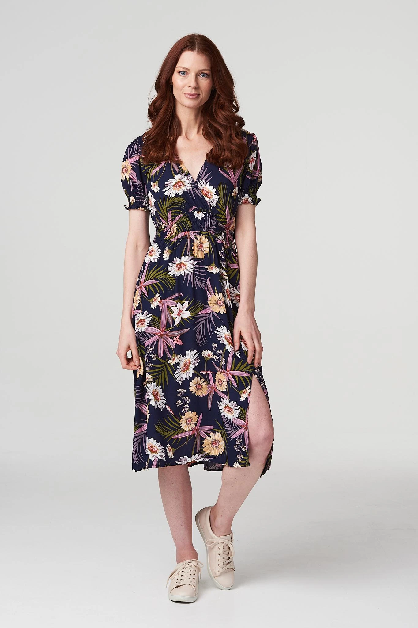 IZABEL LONDON | Every warm weather wardrobe needs a striking floral print like this pretty midi dress. Made from 100% viscose, it has a v-neck, wrap front, shirred waist, short sleeves with shirred cuffs, pockets, and a midi hem falling just below the knee. Pair with neutral heels for a chic style you can wear for lunch in the sunshine with friends.