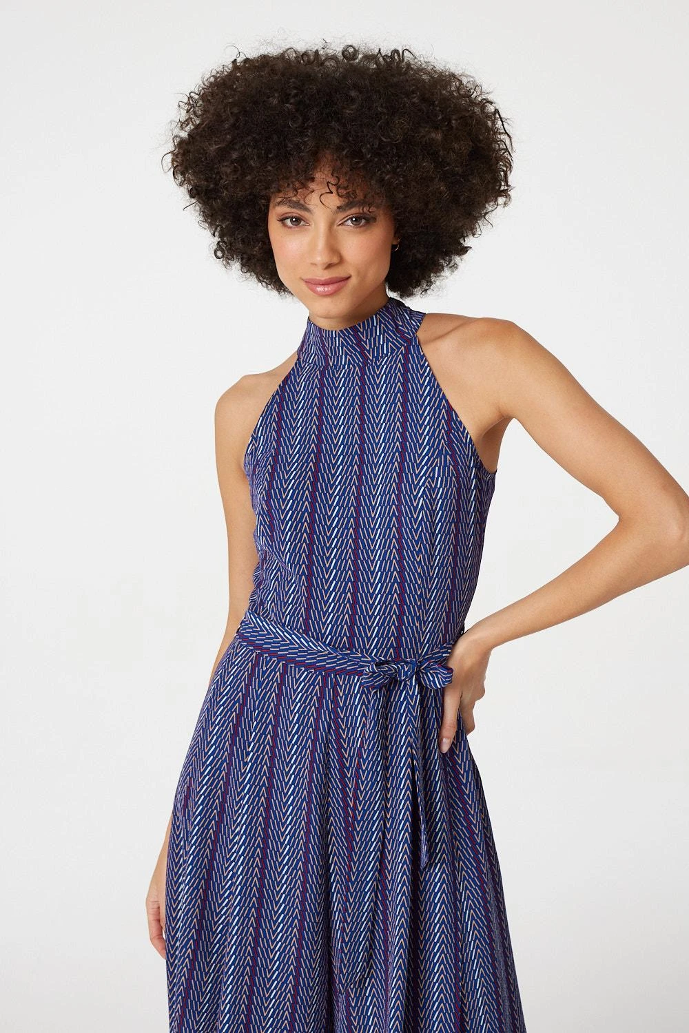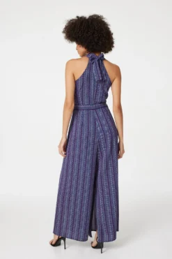 IZABEL LONDON | Swap your usual occasion dress for a glamorous jumpsuit like this one in a statement geo print. It has a halter neck, self tie waist, and a wide leg silhouette with front splits. Style with your favourite strappy heels to turn heads at any party.