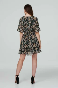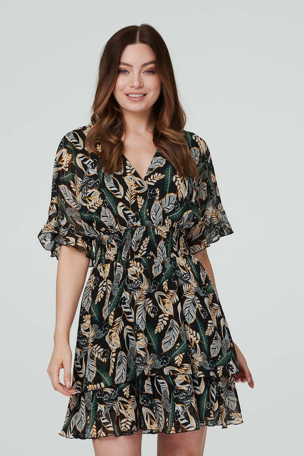 IZABEL LONDON | Add a vibrant wrap dress to your wardrobe with this leaf print mini dress. It has a v-neck, wrap front, shirred waist, 1/2 sleeves with a frill trim, and a mini pephem skirt. Add a pair of strappy neutral heels for a standout style that would be perfect for drinks out with the girls, date night, or even an alfresco dinner on holiday.