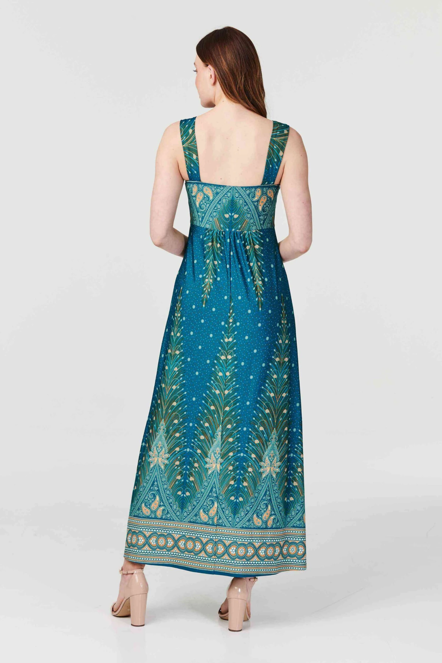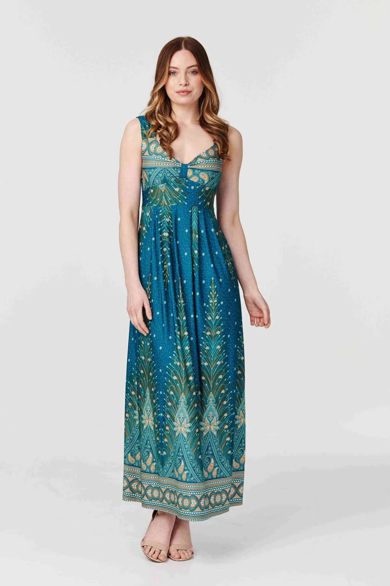 IZABEL LONDON | The perfect warm weather update is this paisley printed a-line maxi dress. With a v-neck, wide cami straps, an empire waist and a straight full length skirt. Pair with blush heels for a chic dinner outfit on vacation or dress down with flat sandals.