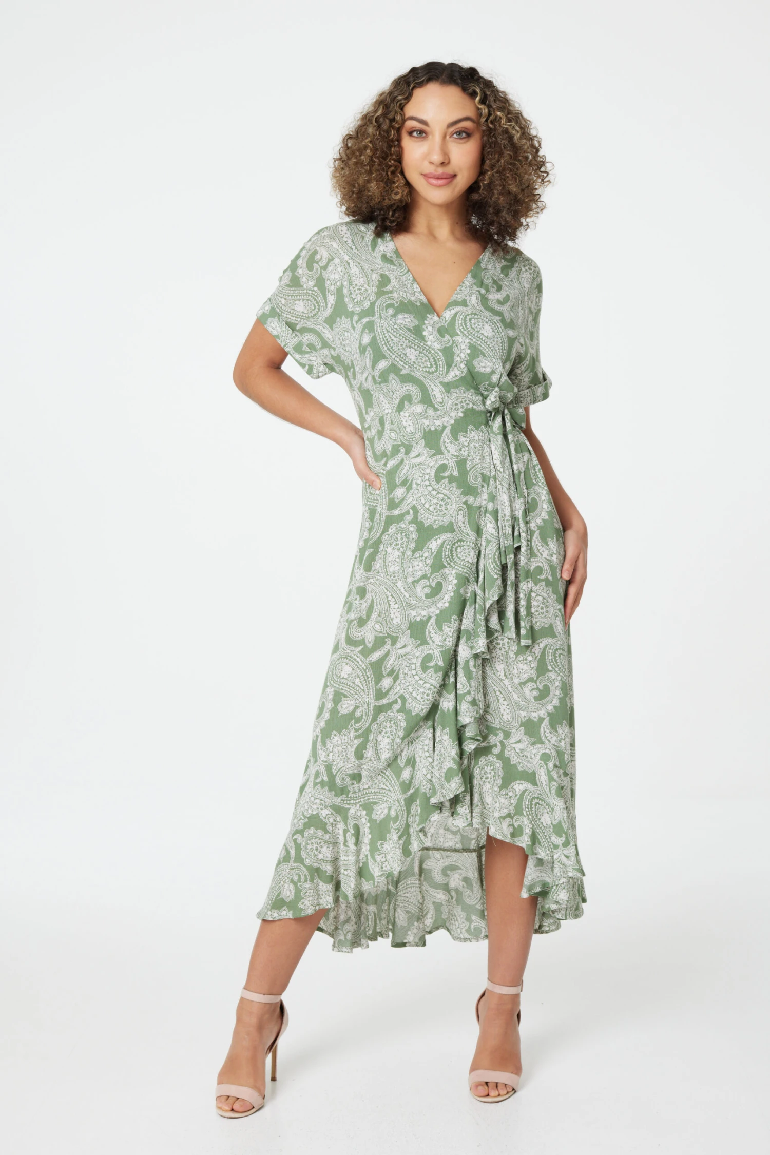 IZABEL LONDON | Add a paisley print to your dress collection with this short sleeve wrap midi. Made from 100% viscose, it has a v-neck, short turn up sleeves, a self tie front, and a tiered midi skirt. Style with blush heels for a chic warm weather look that’s perfect for a day at the races or a daytime wedding.