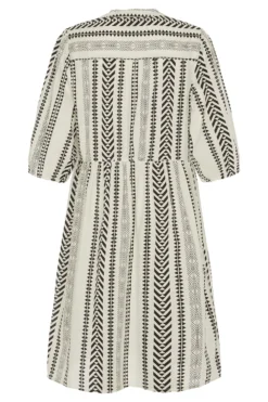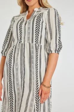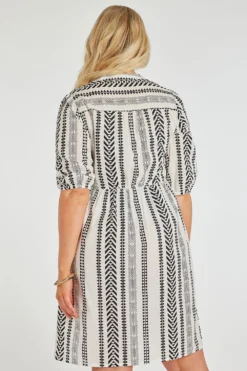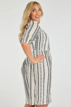 Stand out this Summer with this jacquard print striped dress. Complete with 3/4 sleeves and a v-neckline to keep you cool and fashionable this season. Wear with sandals and a small crossbody bag for a great holiday look.