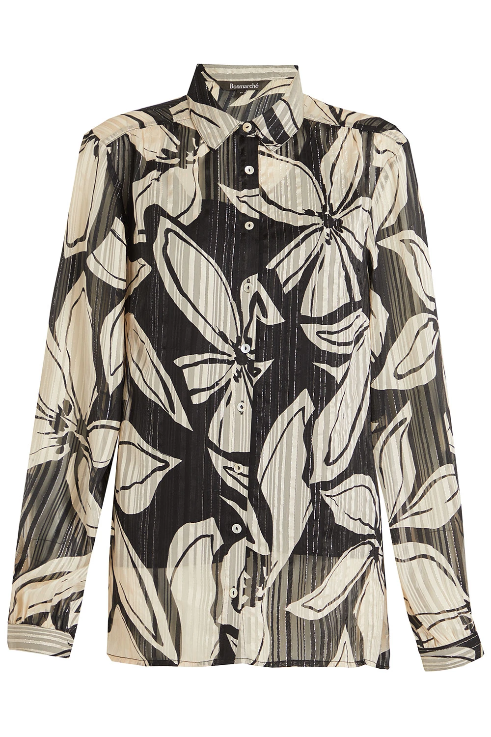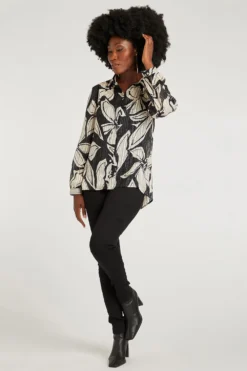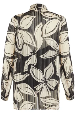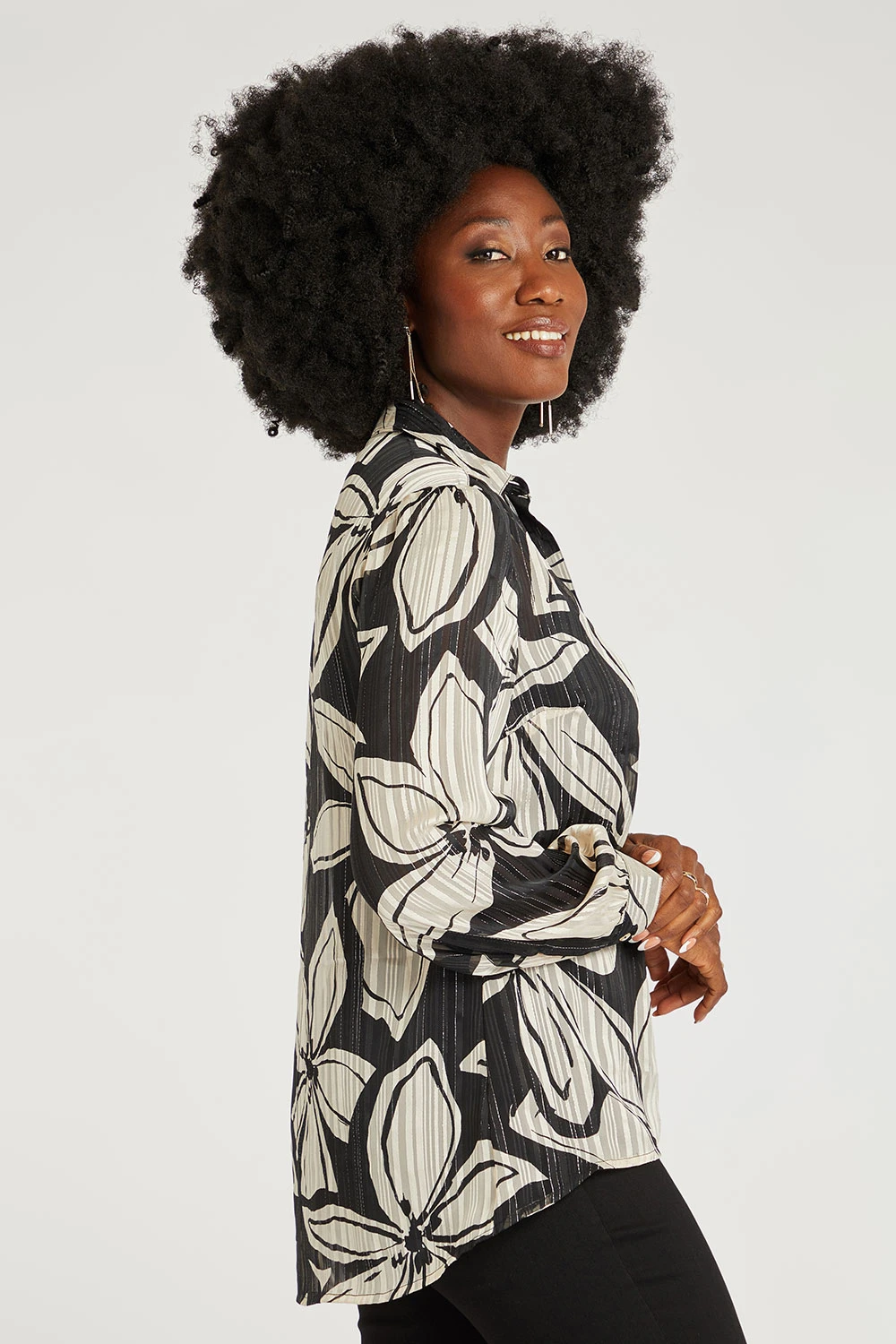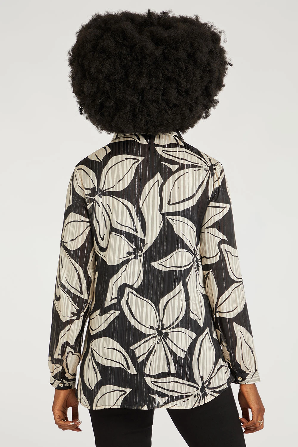 This stylish large floral print shirt is ideal for multiple occasions. A metallic lurex stripe adds a modern touch to the classic shirt style and also features long sleeves and a collared neckline. Team it with a pencil skirt or smart trousers for work or evening events or simply pair it with your favourite jeans for a smart casual look.