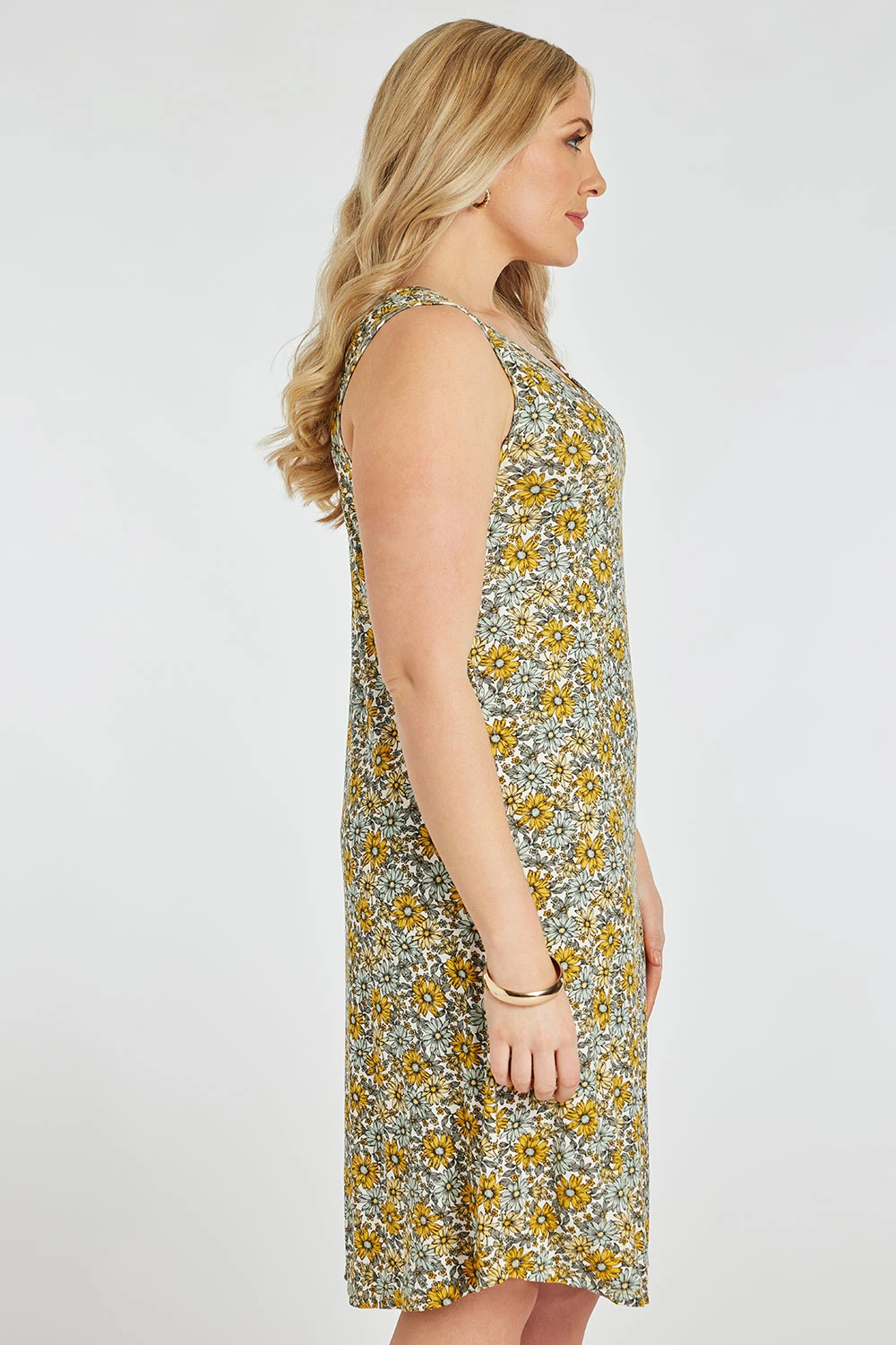 Get ready for Summer with this beautifully designed linear daisy print swing dress. Complete with a sleeveless design and jersey material to keep you comfortable and stylish this season. Wear with sandals and a light jacket for a great evening Summer look.