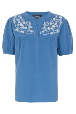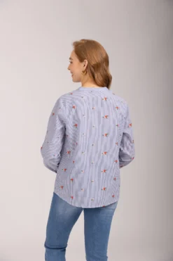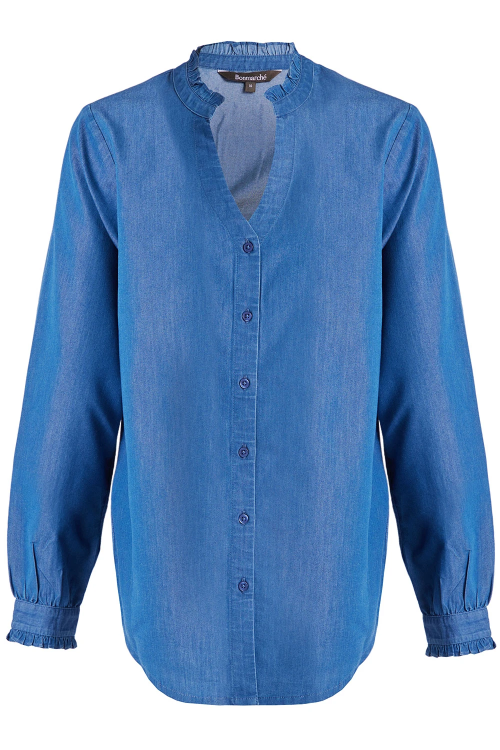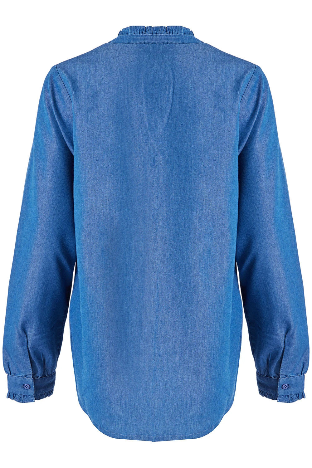 This denim shirt is a must-have for any wardrobe. It can be dressed up or even for casual days. The button-through design and frill collar add a delicate touch. Pair with your favourite ankle boots and black jeans for a stylish look.