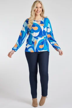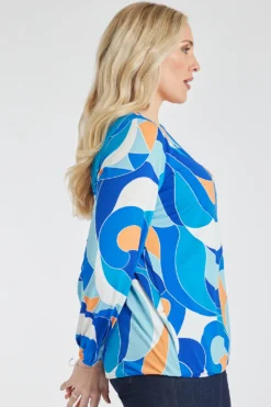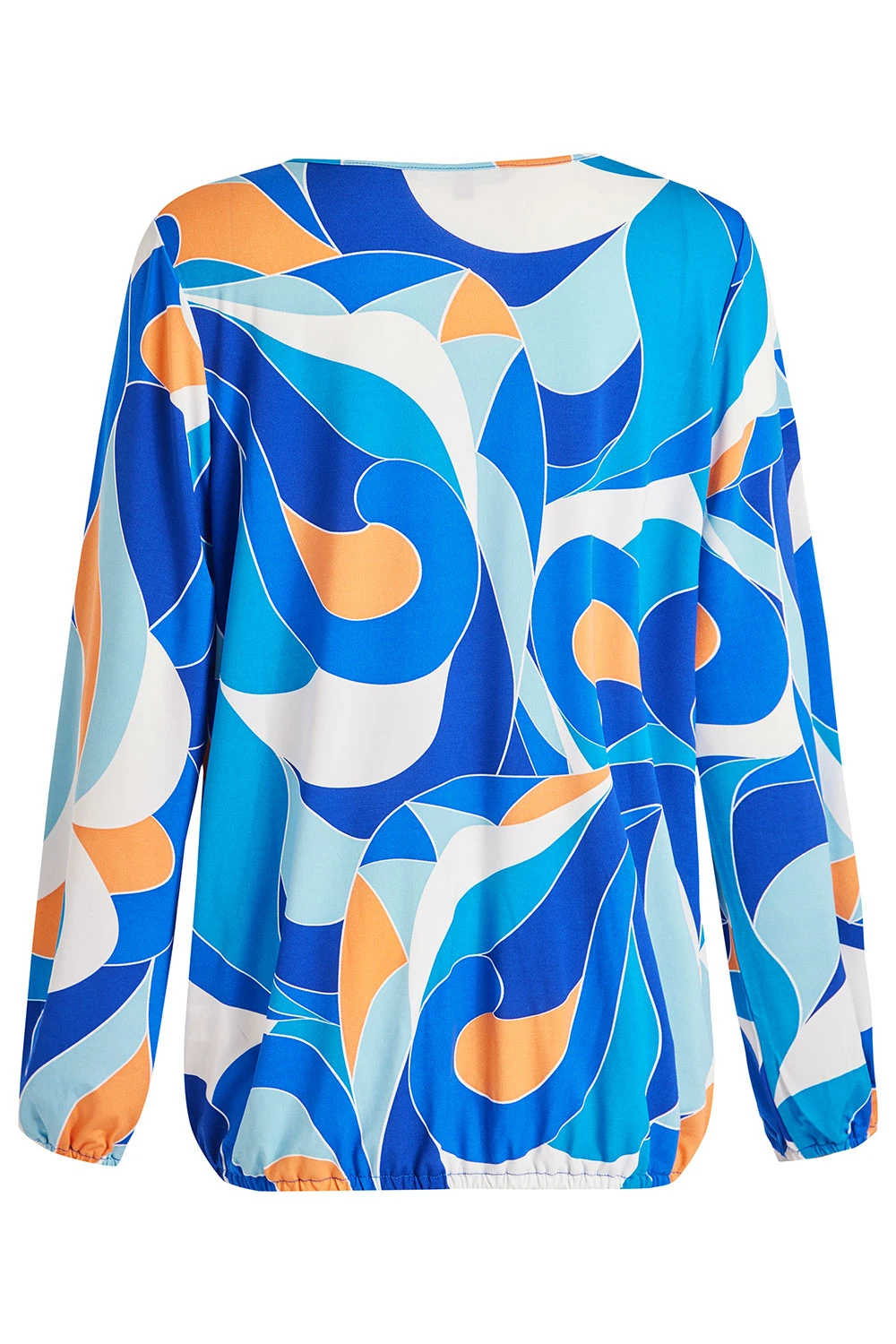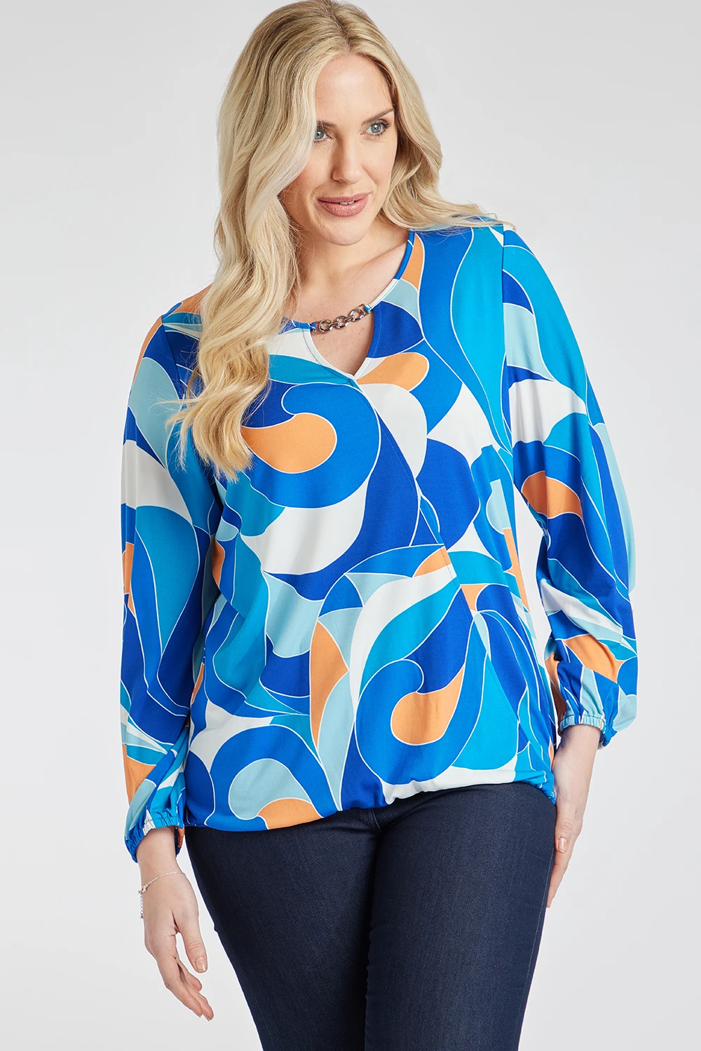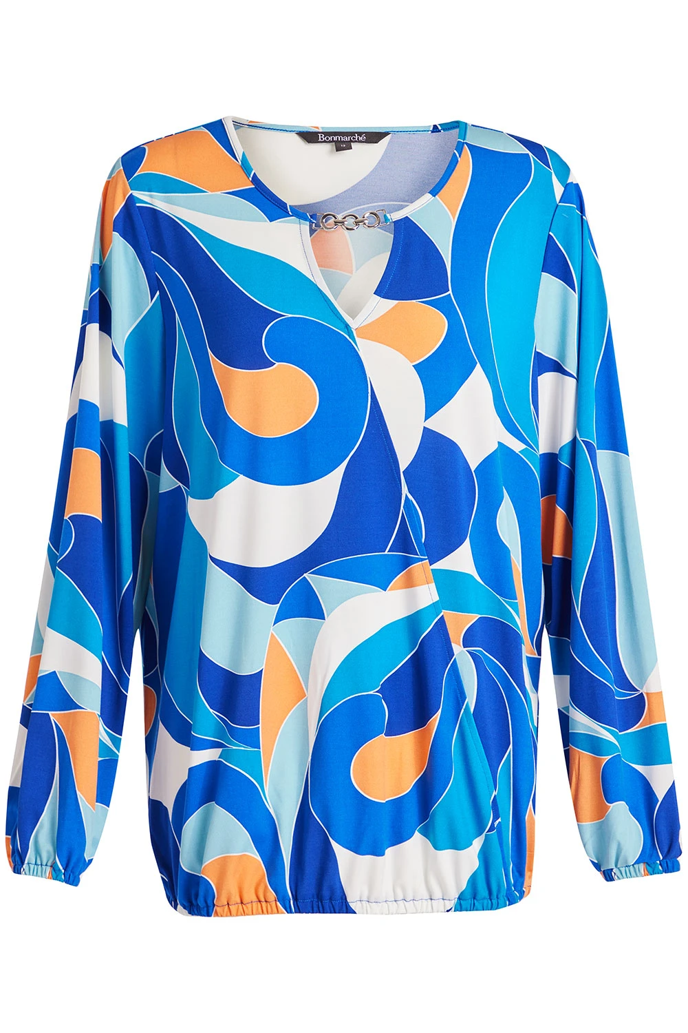 Add this vibrant geo swirl wrap top to your Spring collection for a season must-have. The chain detail on the notch neckline and the abstract design make it a stand out piece. A part of Lorraine Loves, chosen by Lorraine Kelly. It is perfect for pairing with trousers for an office look or with jeans for a more dressed-down look.