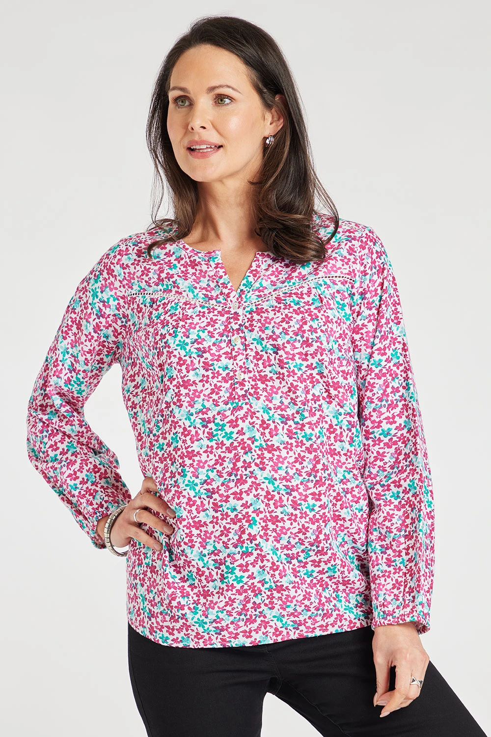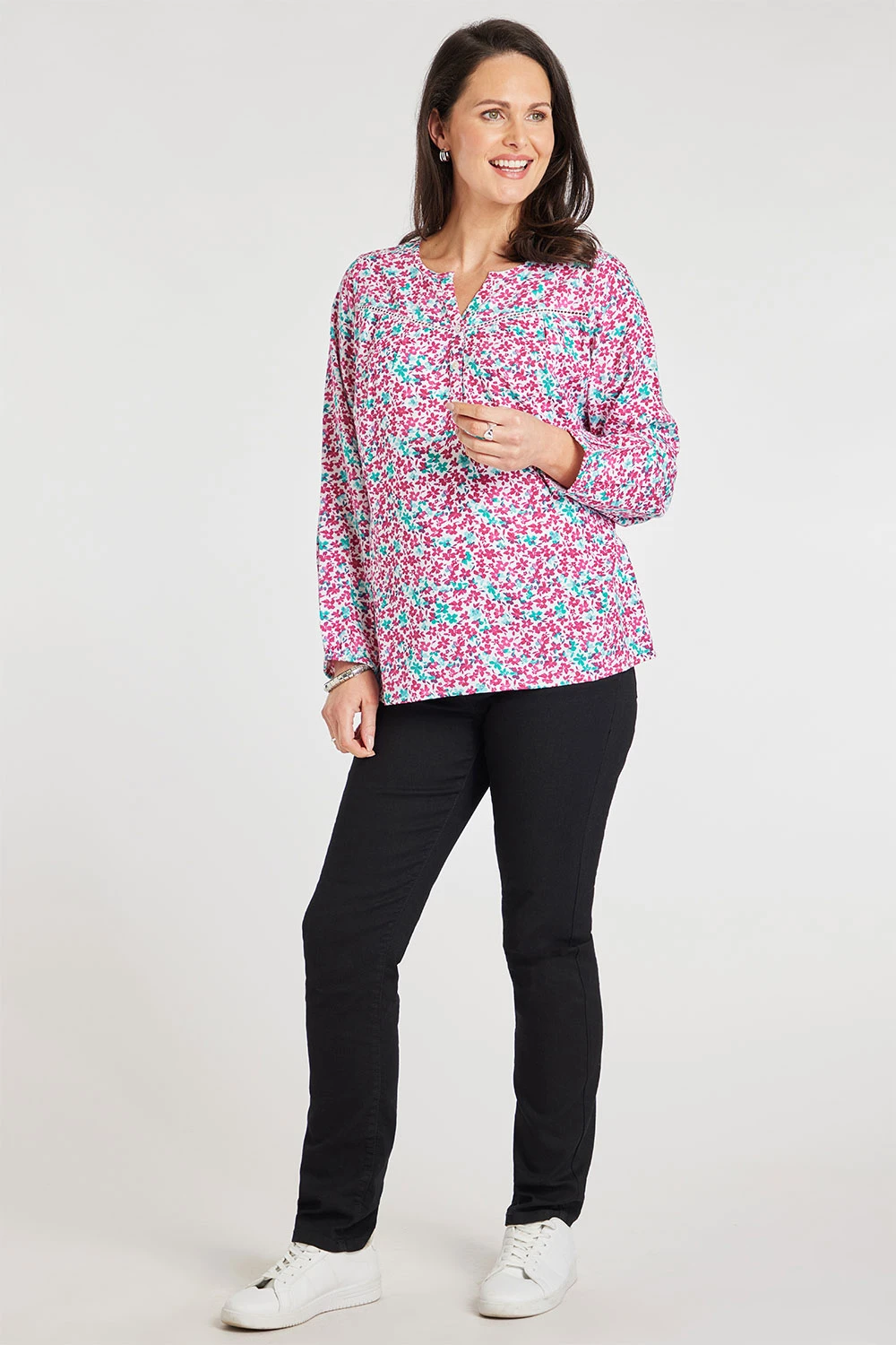 Add colour and print to your look with this versatile shirt which features a pretty ditsy floral print. A unique selection by Lorraine Kelly herself. The style has long sleeves and an overhead design. It is topped off by a V neckline. This is the ideal top for both smart and casual occasions.