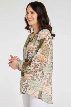 Stand out this season with this patchwork design blouse. Perfect for wearing on colder days in Spring and the pastel colour scheme matches well with the seasons. Complete with long sleeves and a floral design, makes this a must-have. A great blouse handpicked by Lorraine Kelly