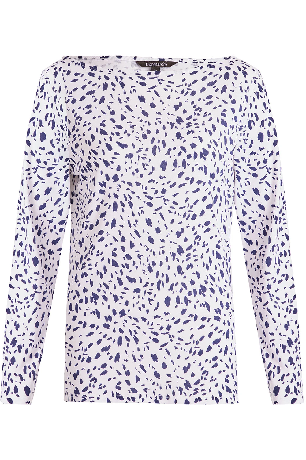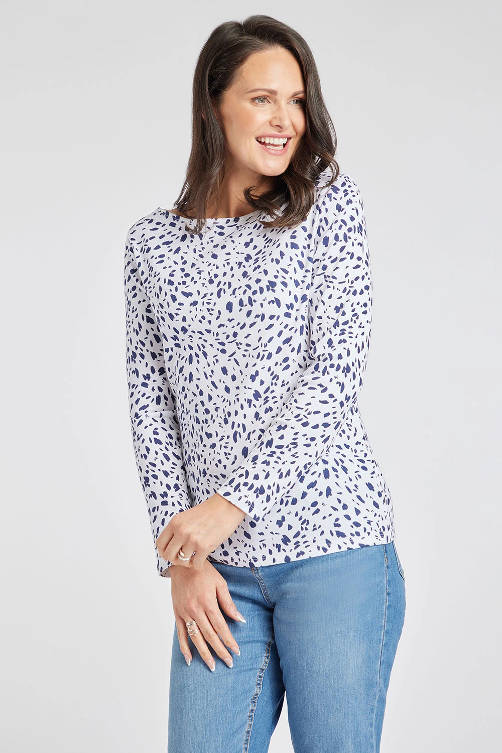 This long sleeve mixed dash top is perfect for layering or for a casual outfit. The print is vivid and would pair well with a subtle trouser or some jeans. Great for layering under a winter coat for the colder months.