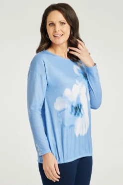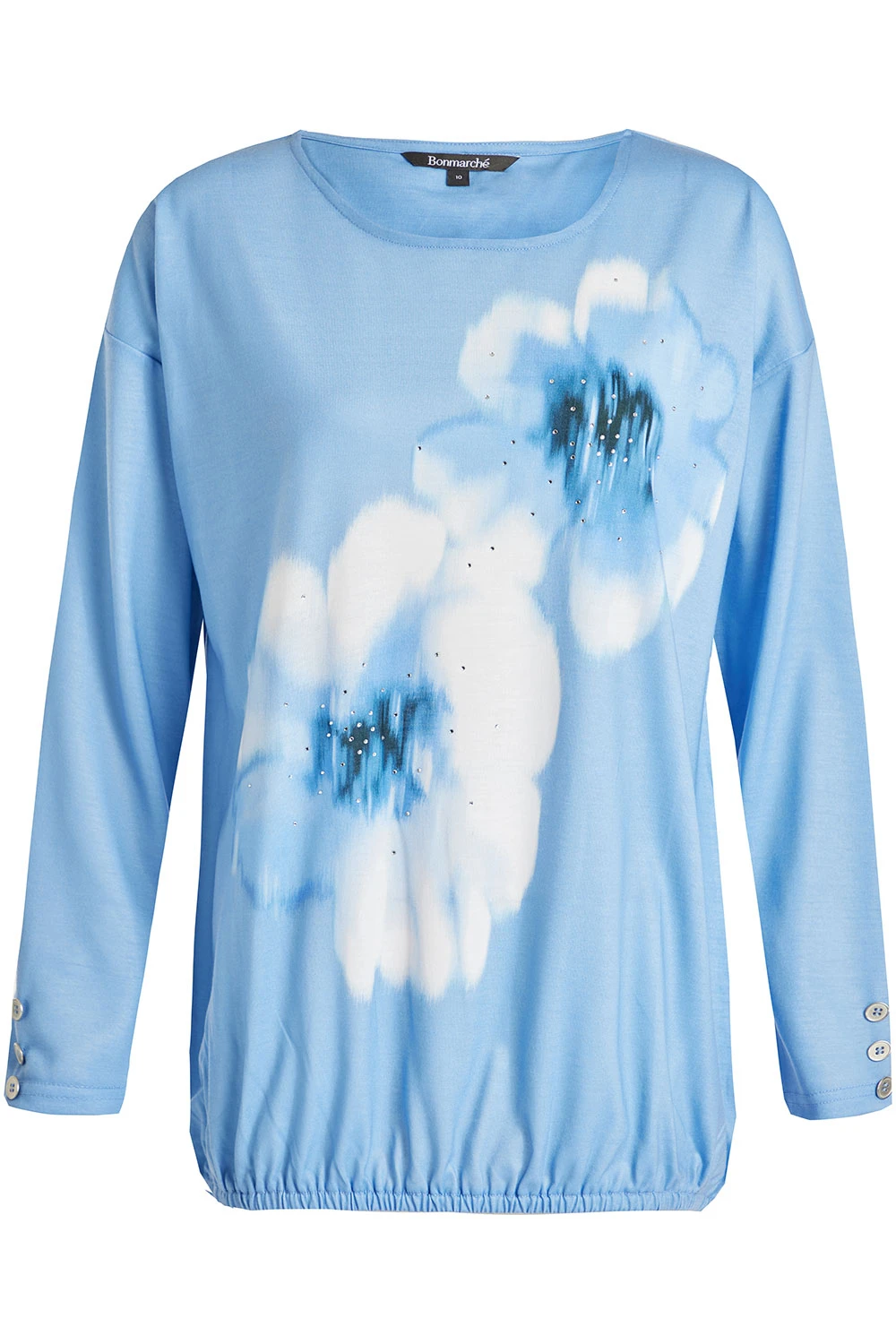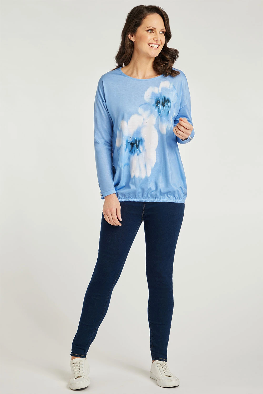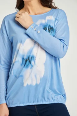 This bold watercolour design is a stand-out piece with a floral design added in. The long sleeves for added warmth and the blue colour scheme for a splash of colour. Pair with jeggings and trainers for a casual weekend look.