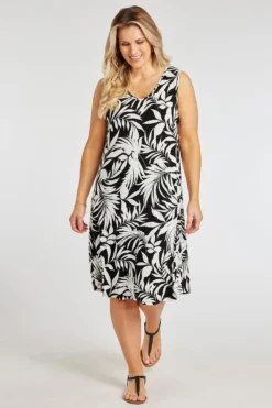 Get ready for Summer with this beautifully designed mono palm print swing dress. Complete with a sleeveless design and jersey material to keep you comfortable and stylish this season. Wear with sandals and a light jacket for a great evening Summer look.