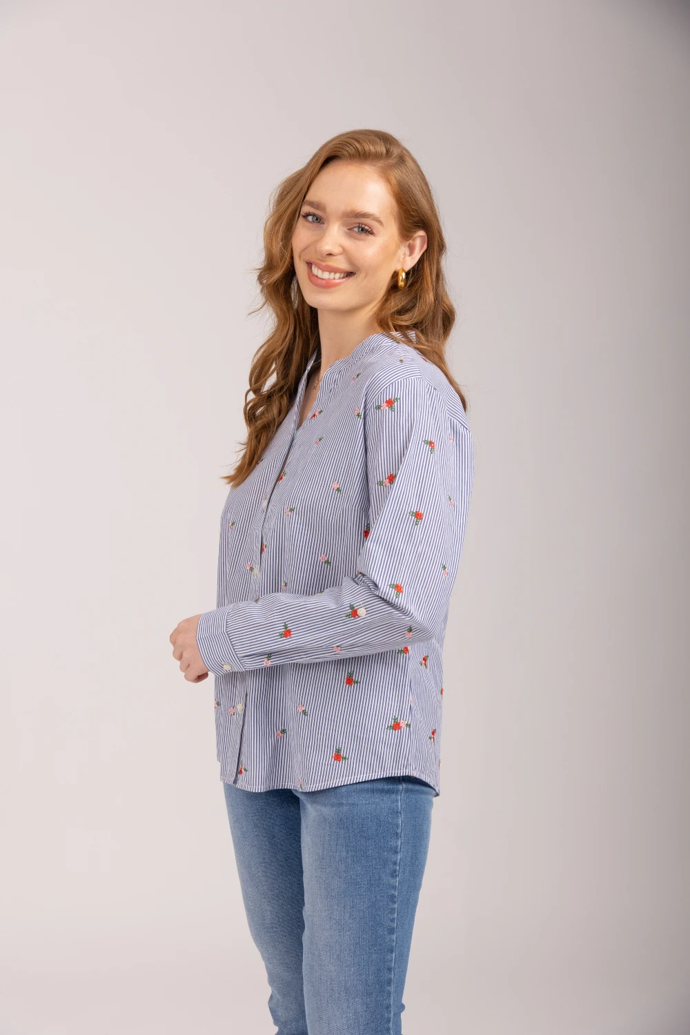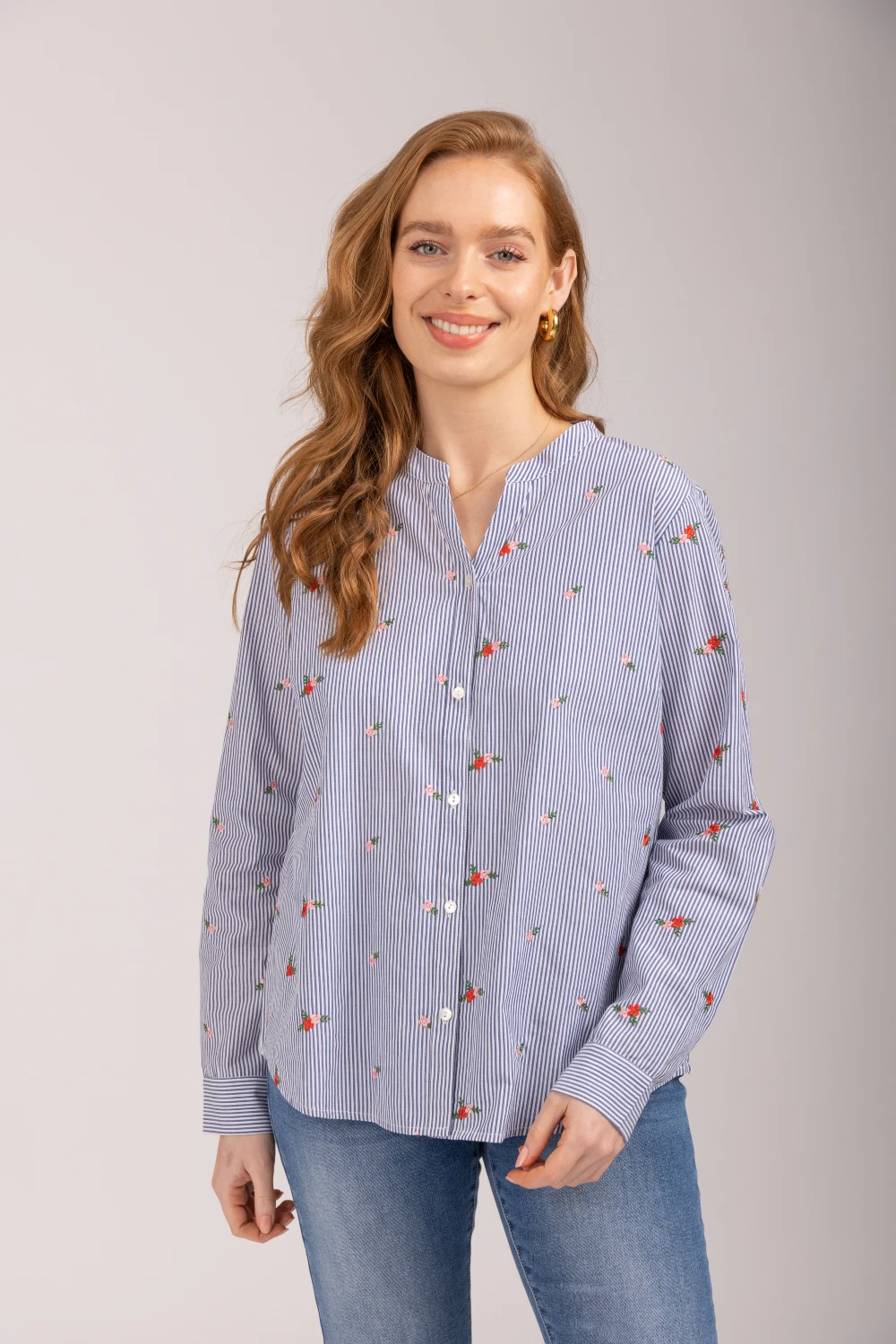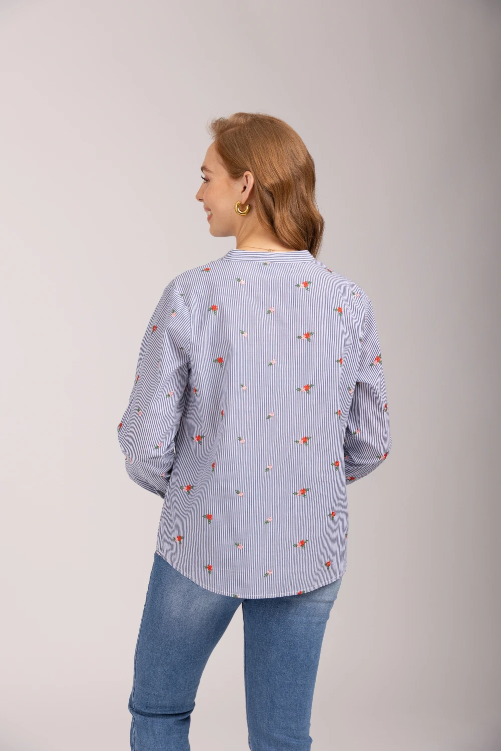 MUDFLOWER | This Embroidered Pinstripe Floral Shirt is the perfect addition to your Spring wardrobe this year. Slip on this top and stay cosy in style with its unique design and colorful print. With its lightweight material, optional 3/4 sleeves, and button detail it’s the perfect addition to your spring and summer wardrobe. We Style with Jeans for the perfect Spring look.