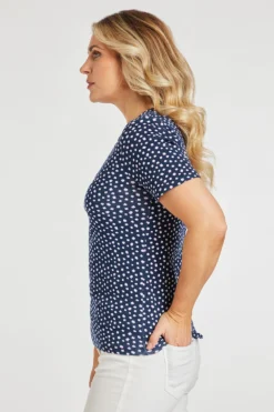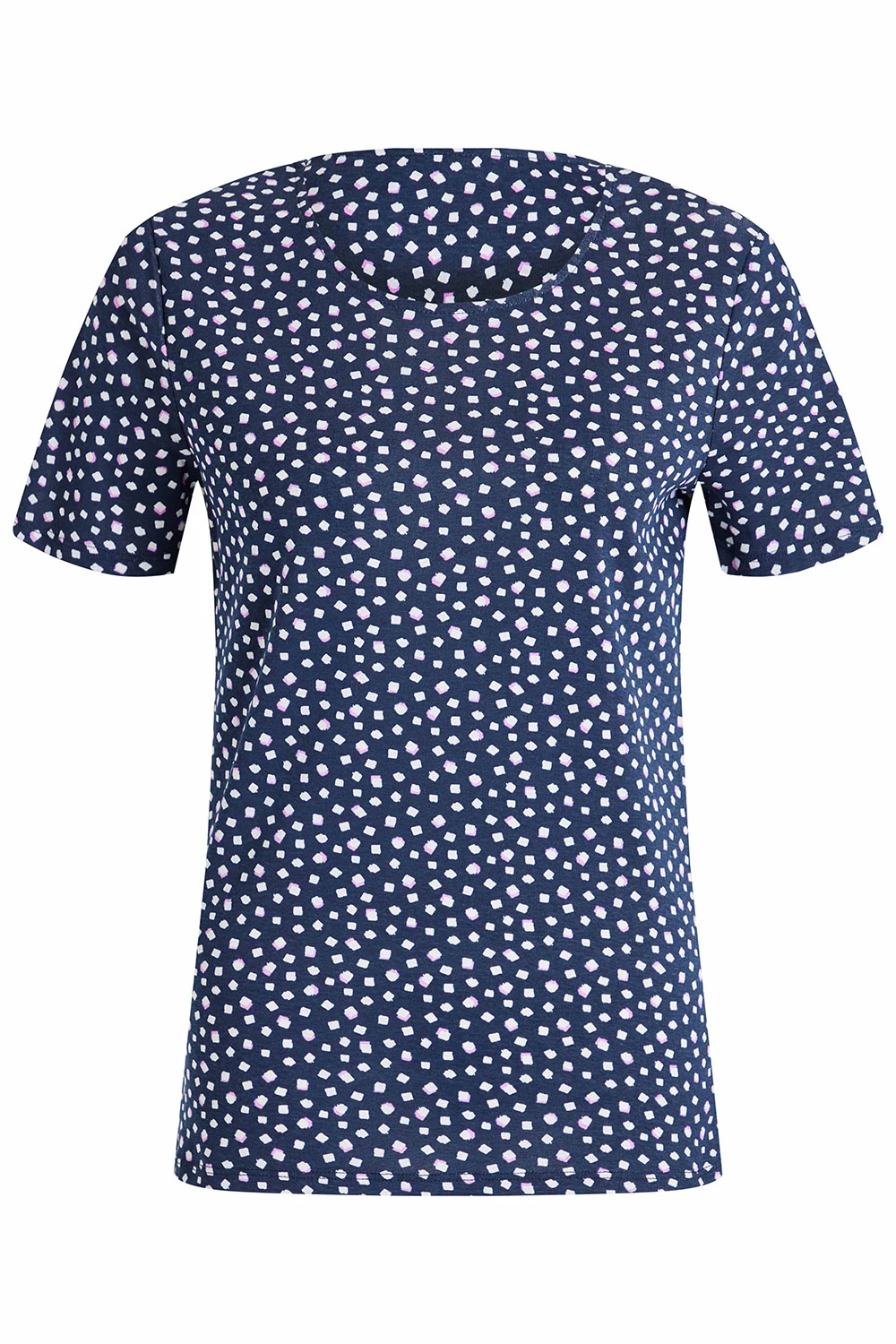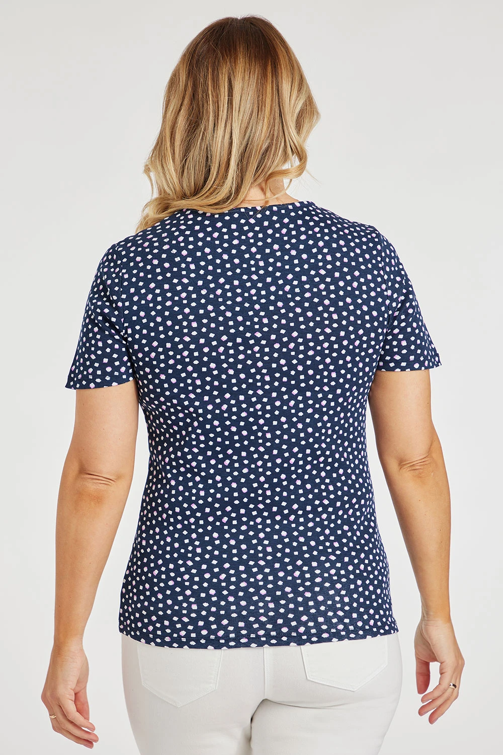 This navy scoop neck printed top is a great piece for your wardrobe. The square dot print and the colour palette make it versatile and easy to wear with other options in your wardrobe. Pair with your favourite jeans and add boots for a casual weekend look.