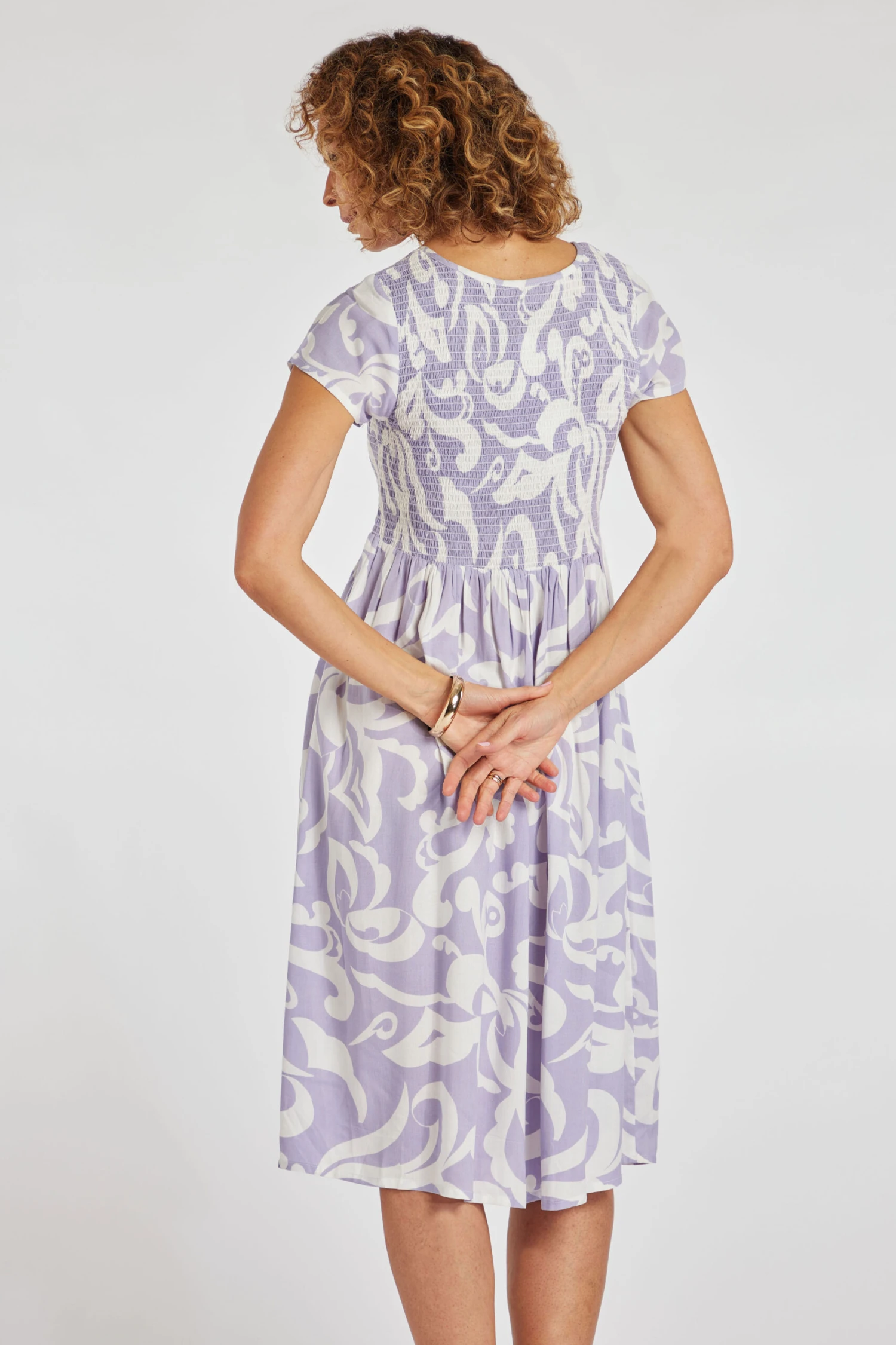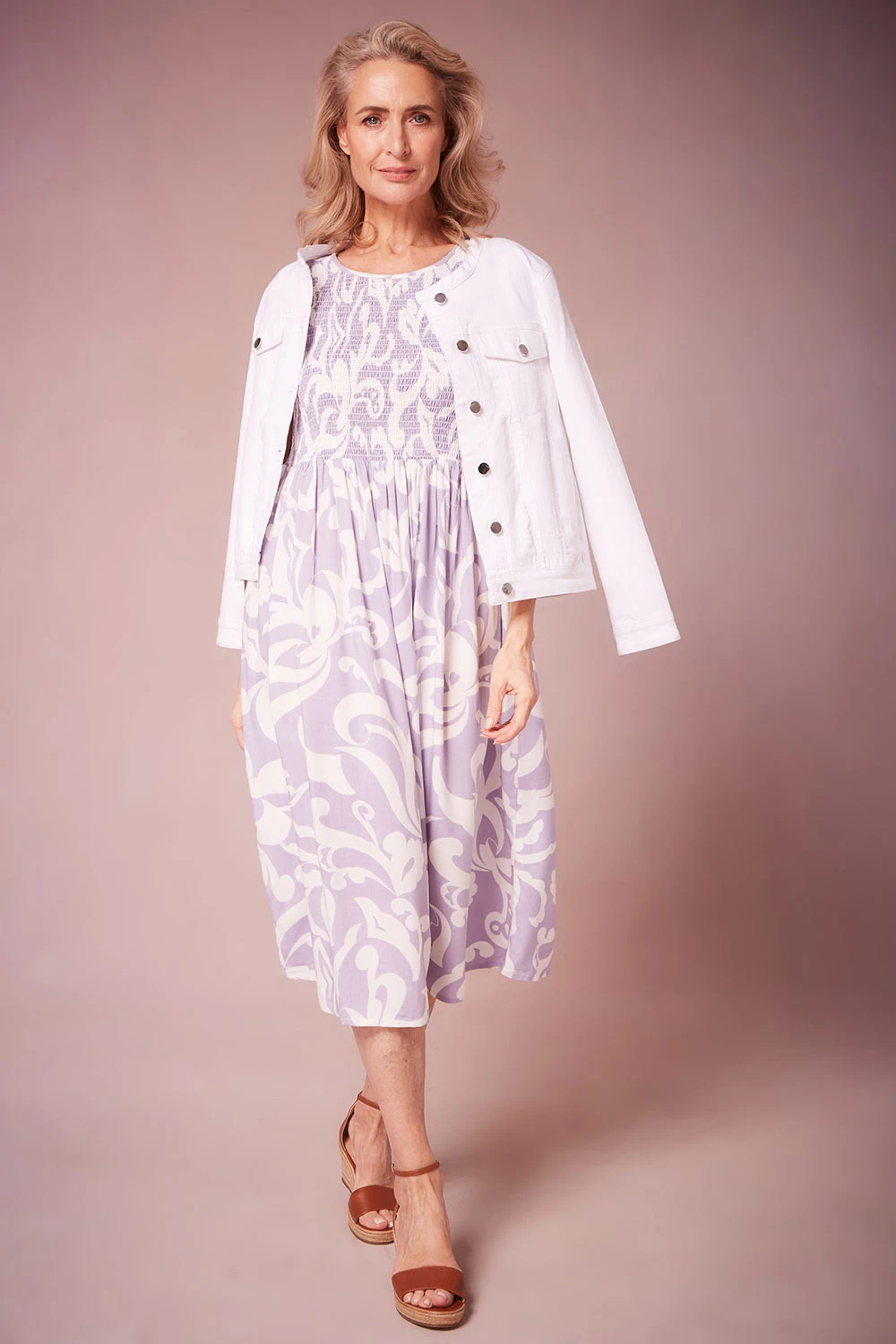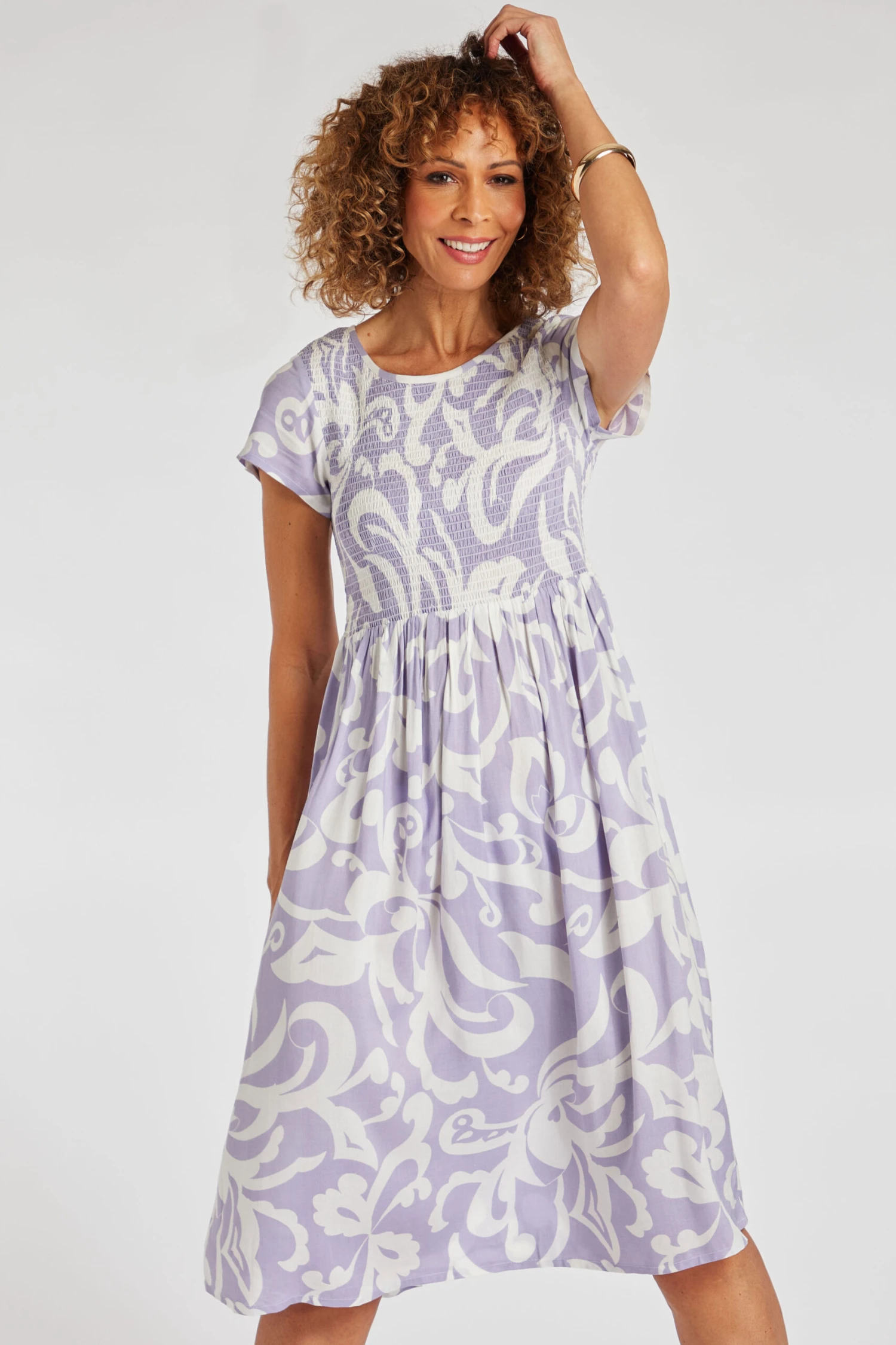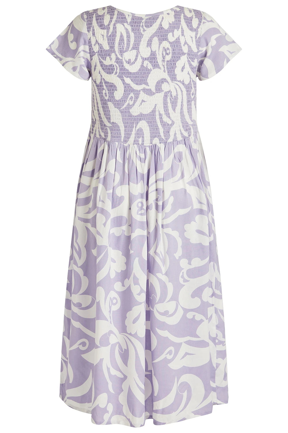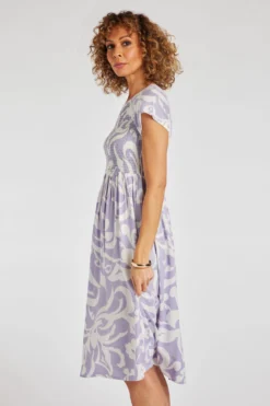 Swish your way through summer in this paisley sundress. With its subtle colour and shirred bodice, it is effortlessly feminine. The loose shape and lightweight fabric help to keep you cool on warm days, wear it with heels and a shawl at night or it’s perfect for a day at the park.