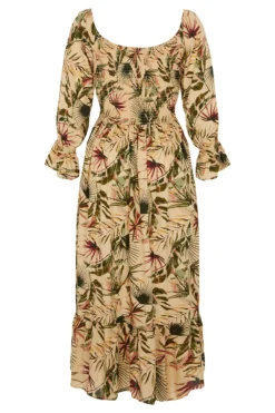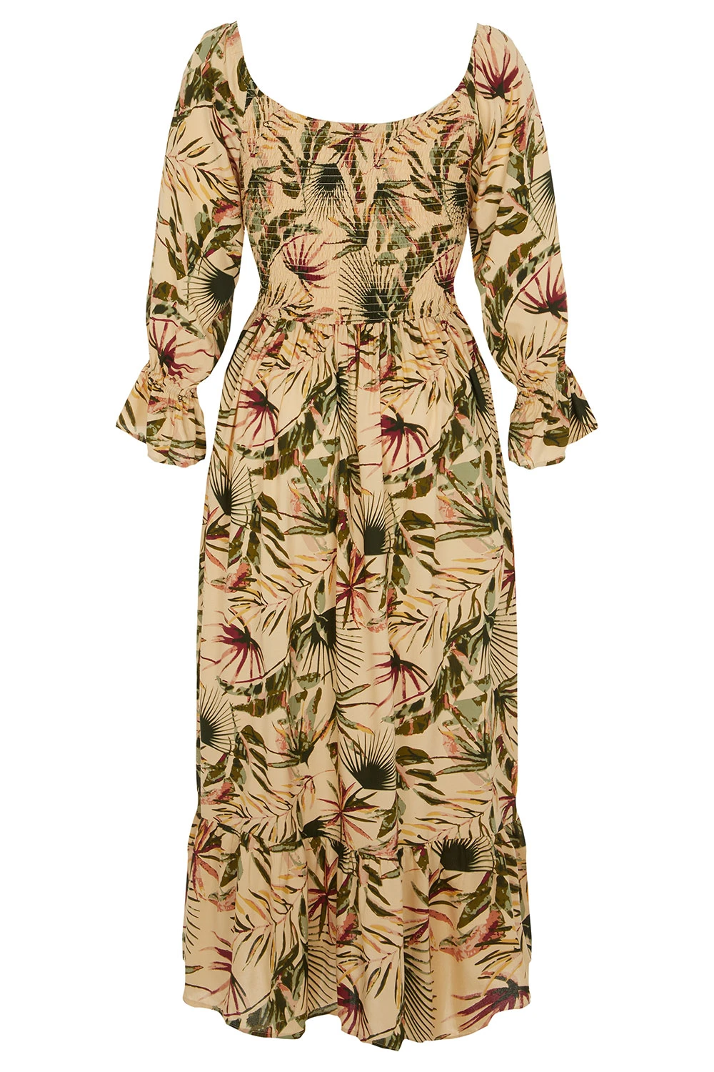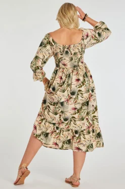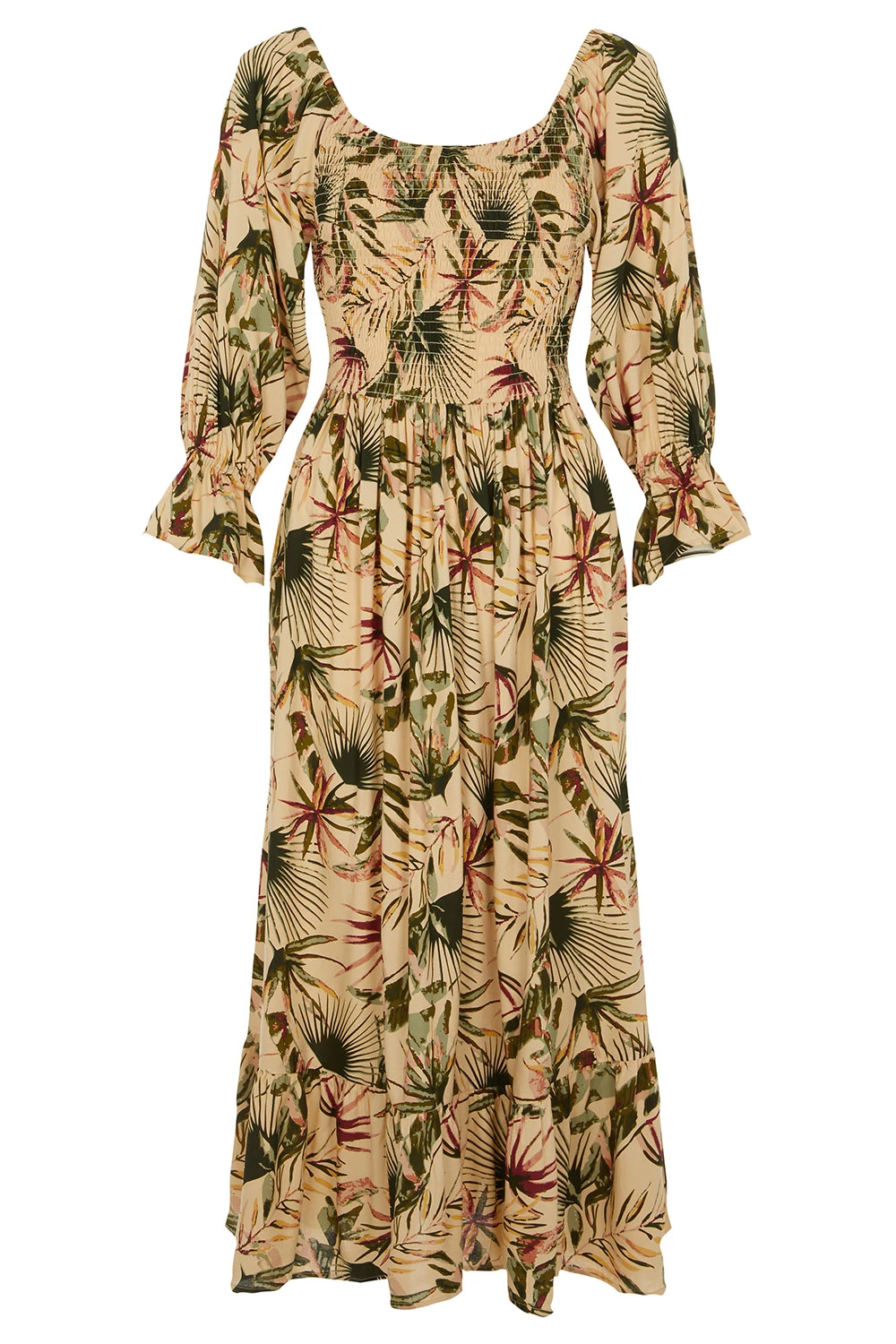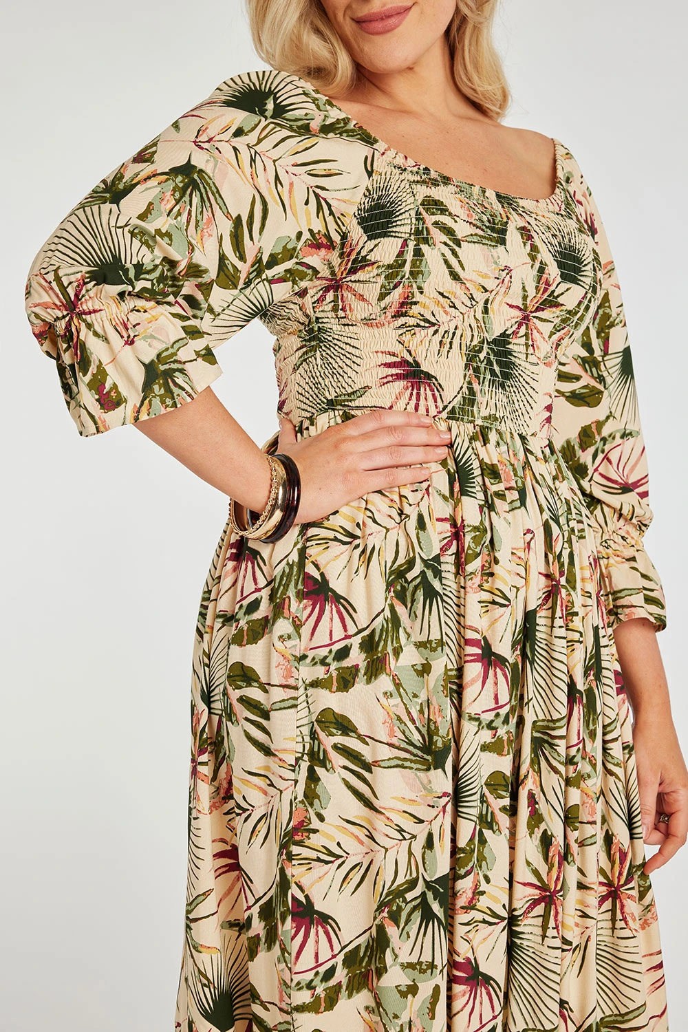 Get ready for Summer with this beautifully designed tropical leaf and flower print maxi dress. Complete with a shirred bodice to create a flattering figure and a smock shape to keep it comfortable and fashionable. Wear with a small handbag and sandals for a great holiday look.