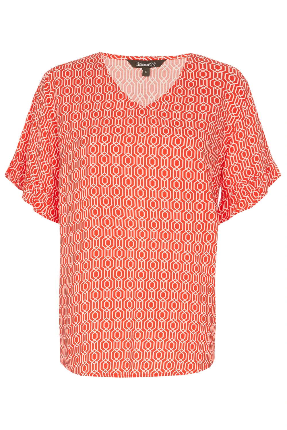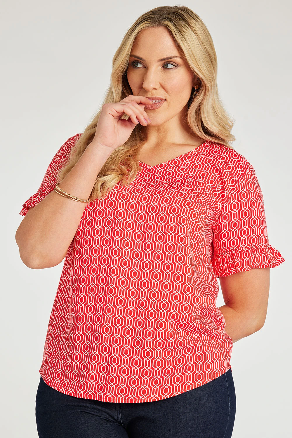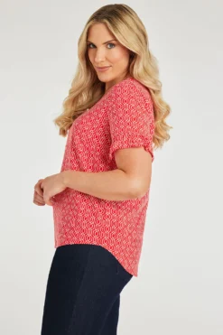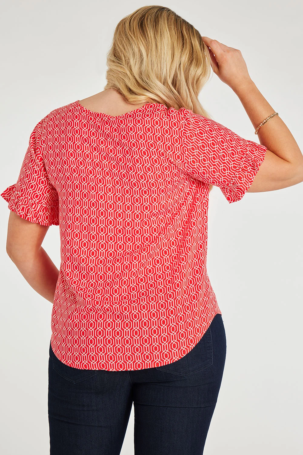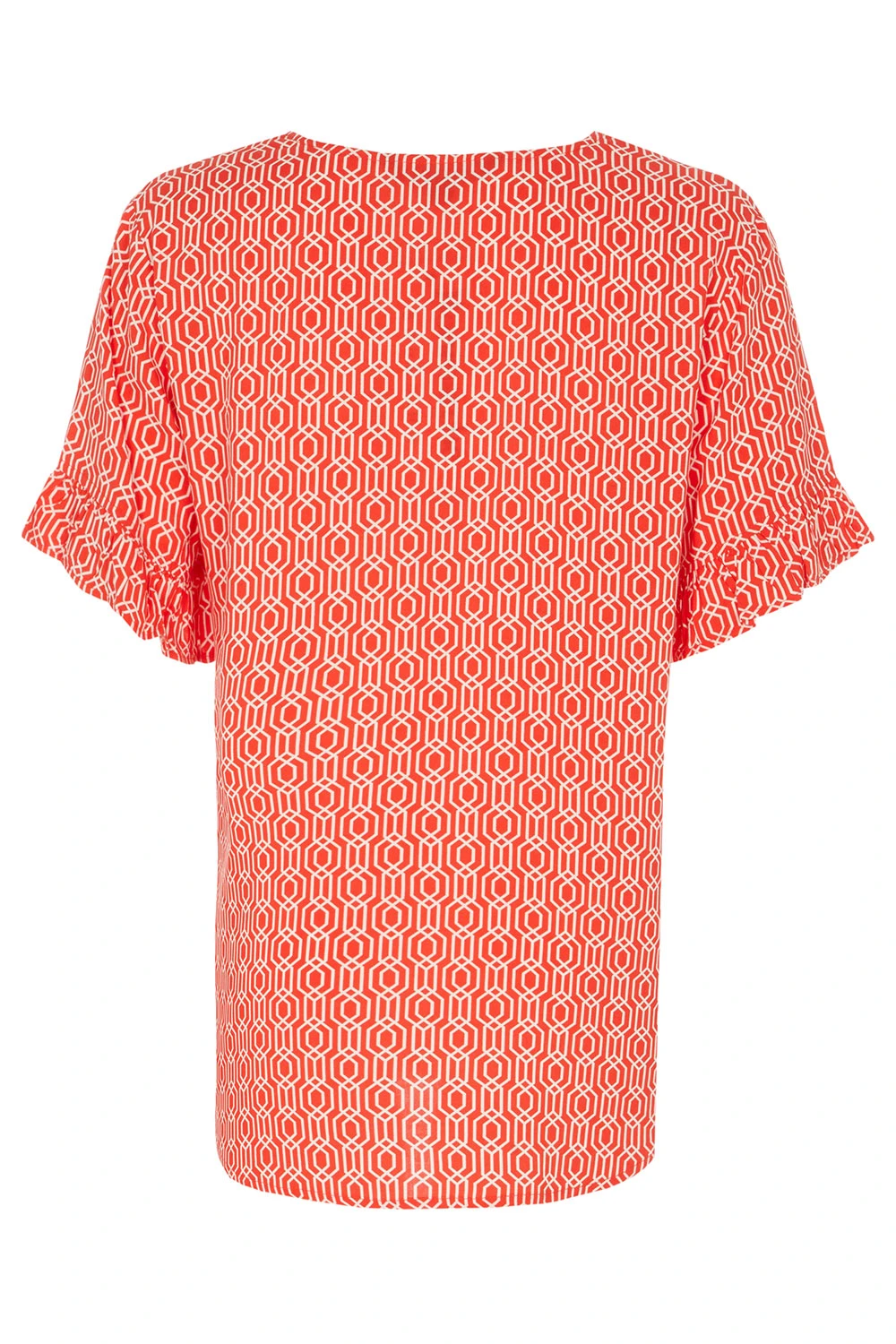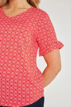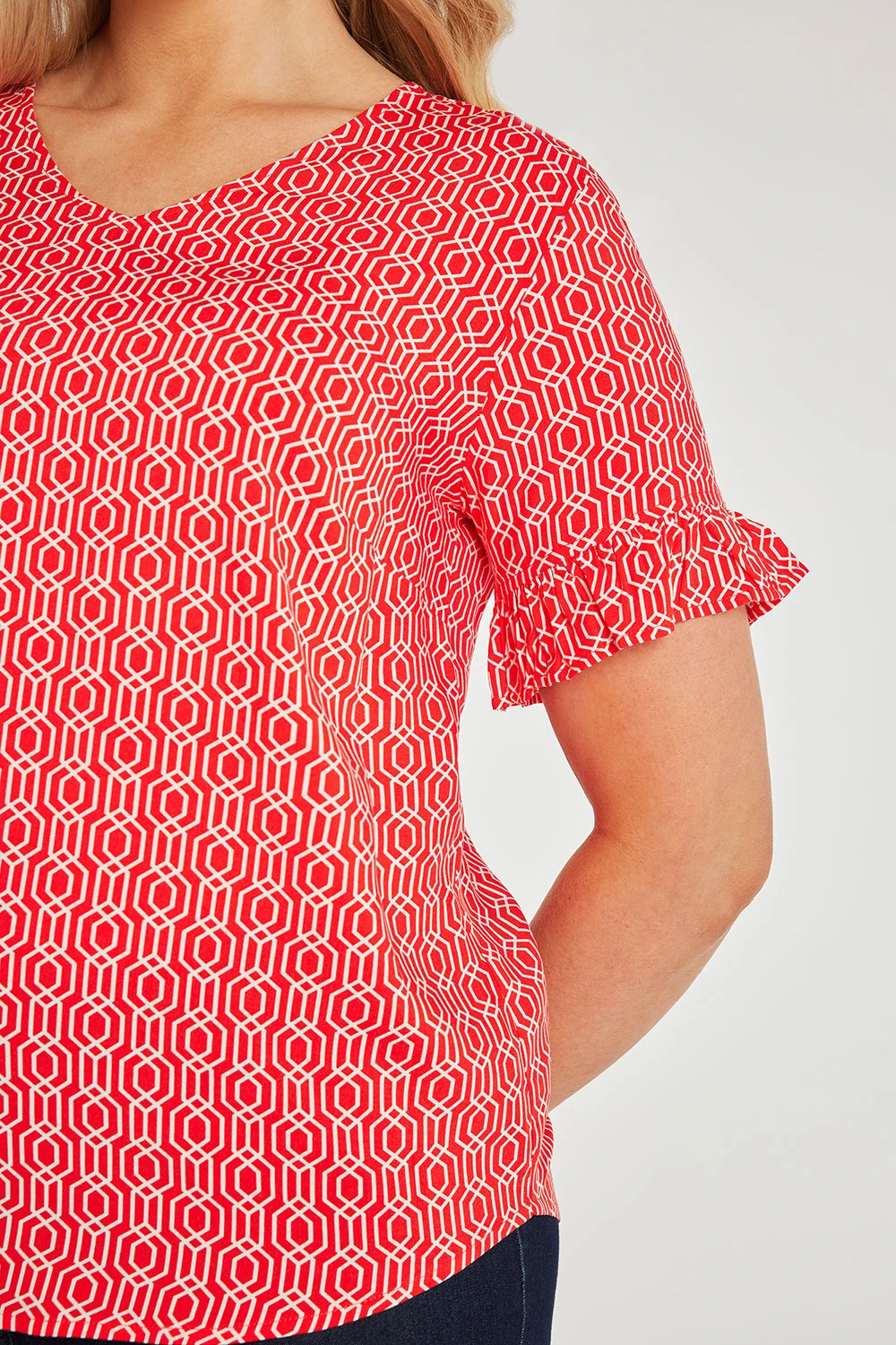 This beautifully designed chain geo print v-neck top is a must have for your collection this season. The v-neckline paired with short frill sleeves makes it comfortable and stylish for when the weather is warmer. Wear with white jeans and sandals for a great Summer look.