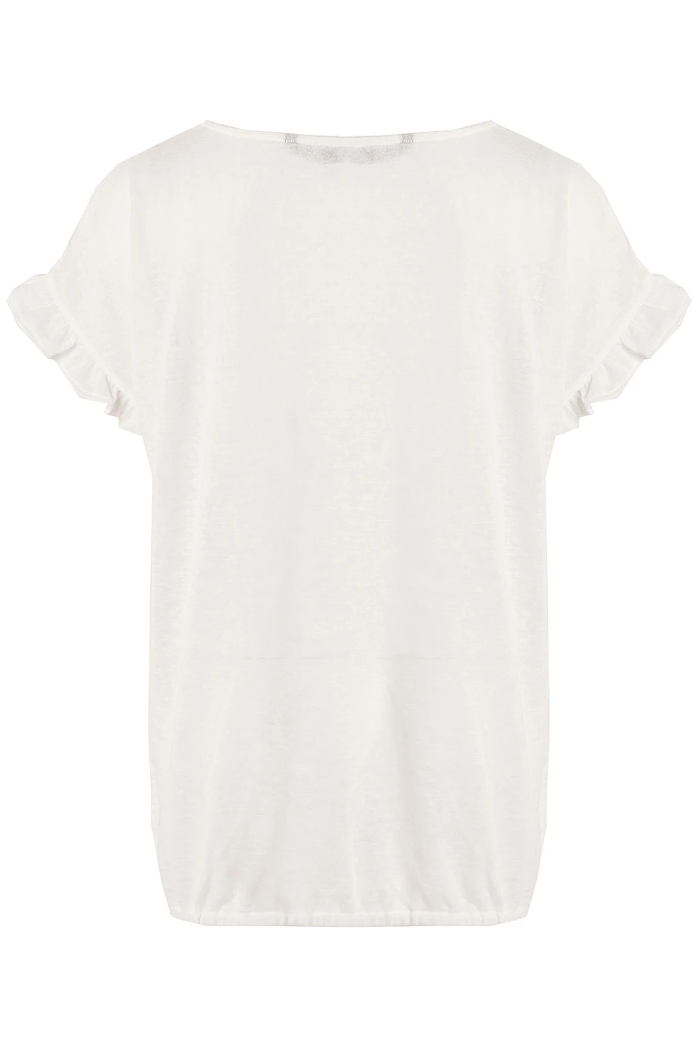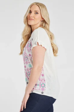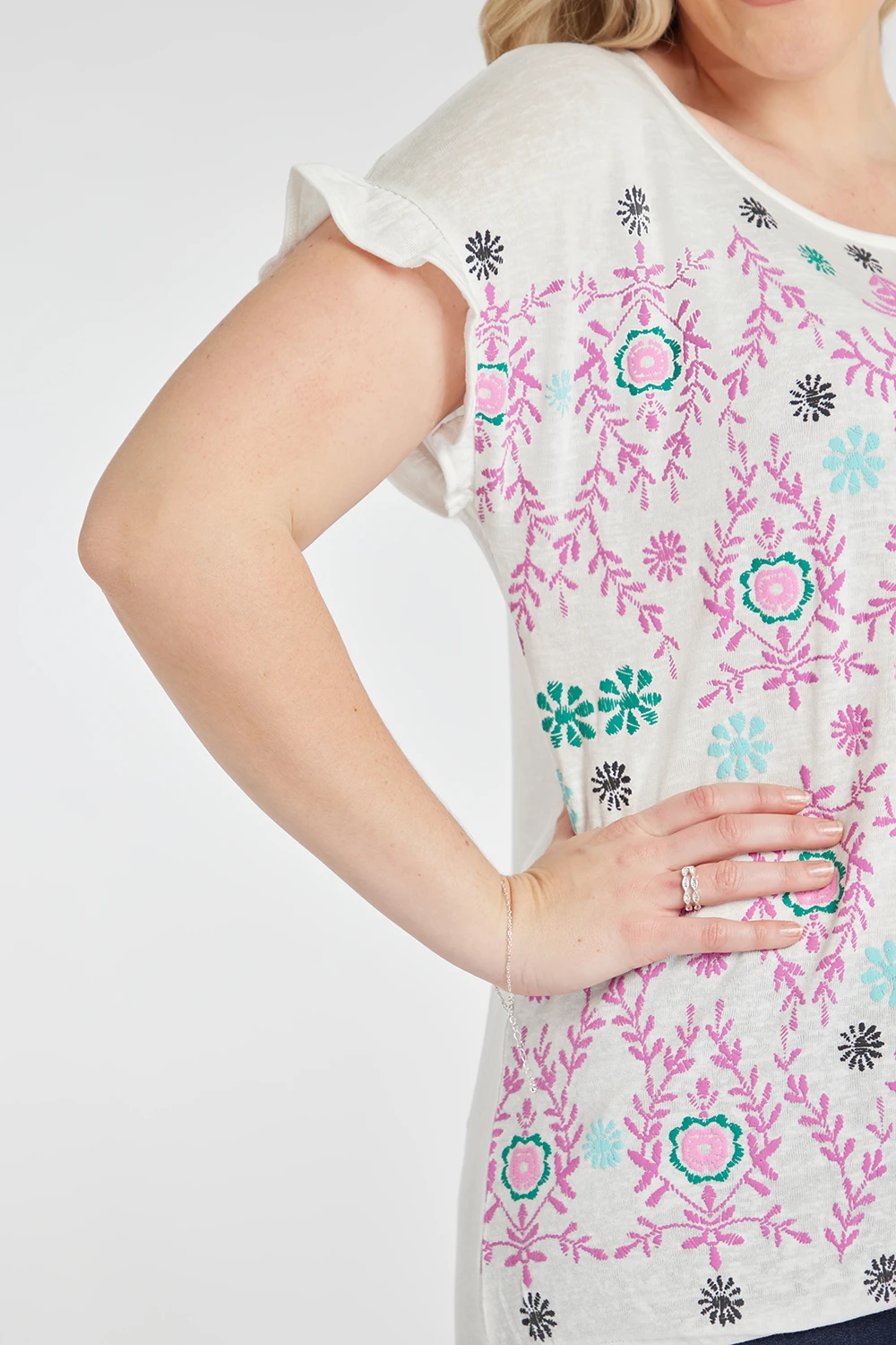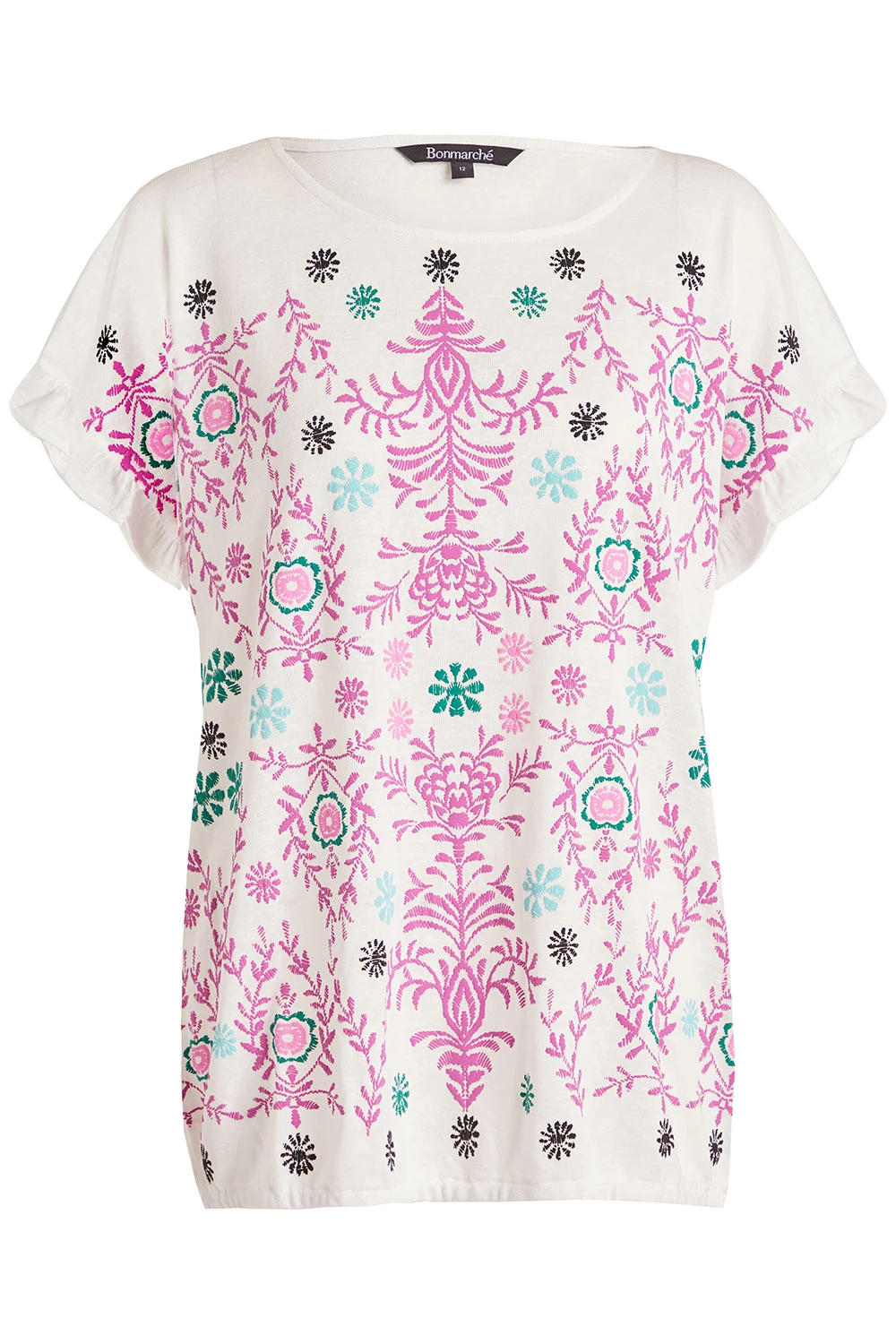 This top would make a great addition to your Summer collection. The embroidered floral design paired with a short frill sleeve adds a feminine touch. The round neck and short sleeves will also make it more breathable in the Summer. Pair with jeans and boots for a casual look.