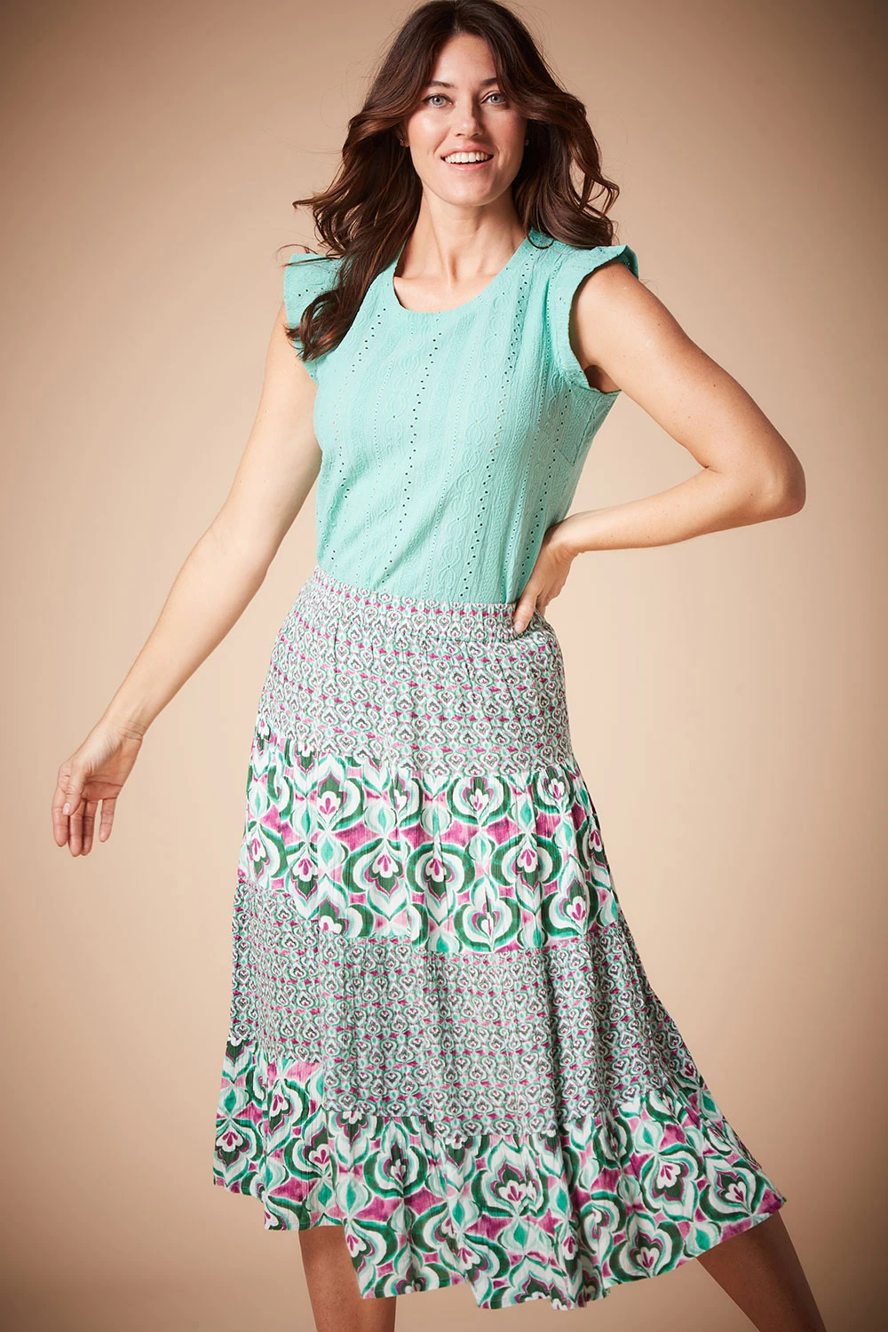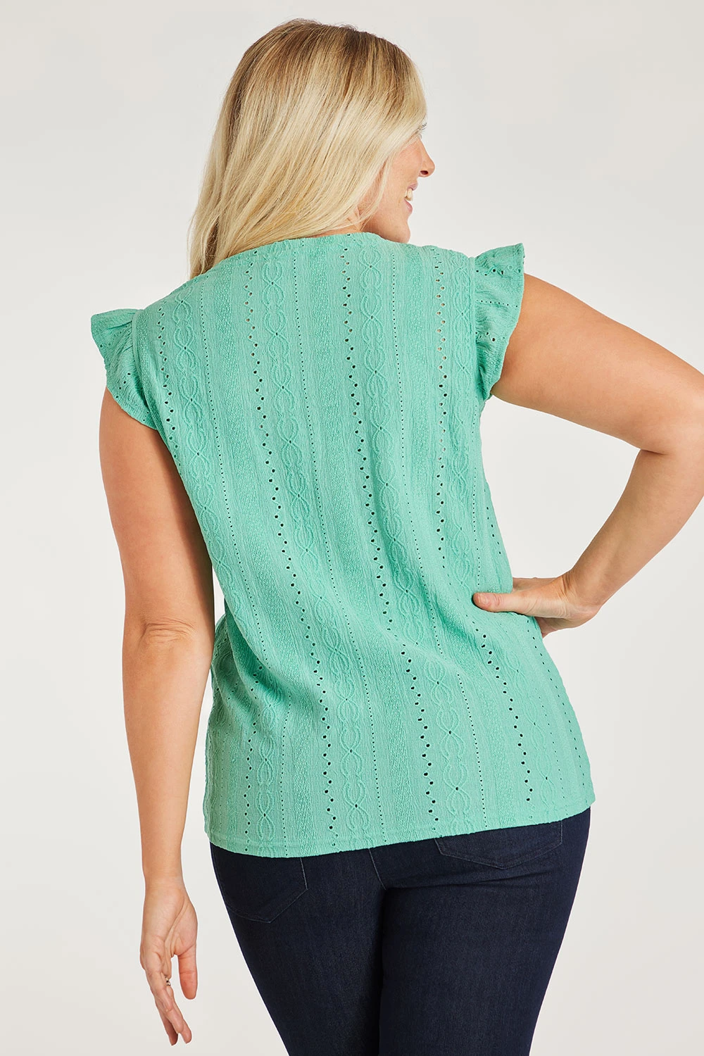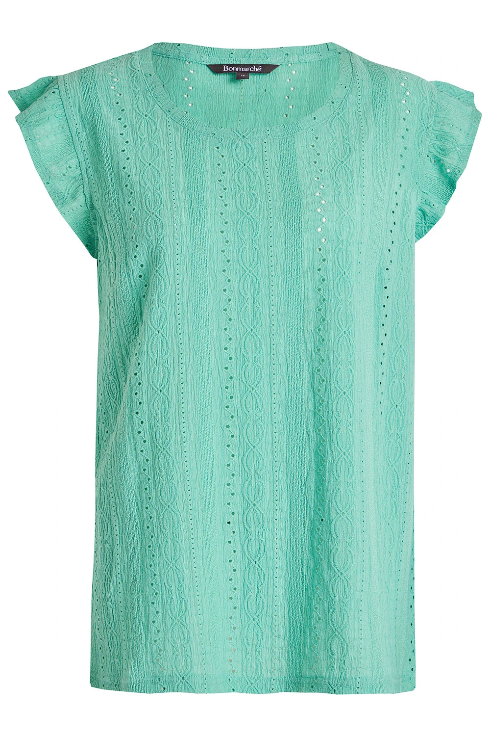 This jersey broderie top is perfect for your Spring wardrobe. The textured fabric on the front paired with the short frill sleeves makes it easy to style with other things you may already have in your wardrobe.
