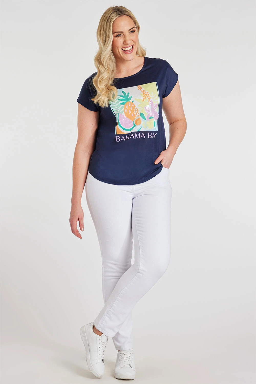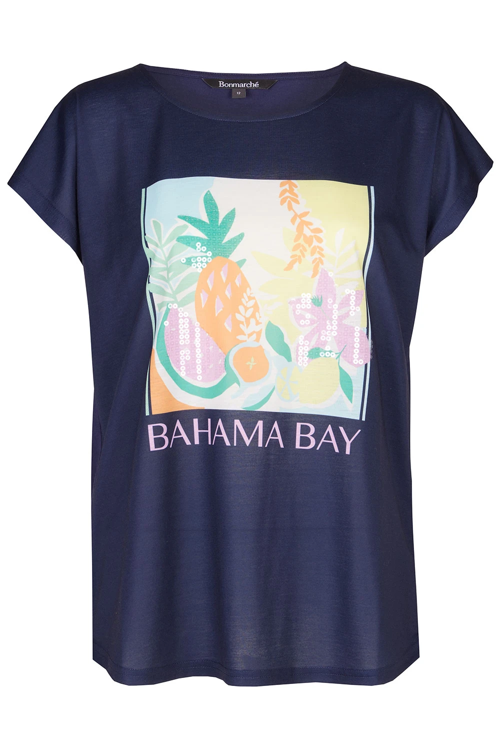 This short sleeve top is perfect for springtime. The Bahama Bay writing paired with the bold print makes this t-shirt a must have. Complete with short sleeves and a round neckline to make it breathable and comfortable. Pair with your favourite jeans and trainers for a casual look.