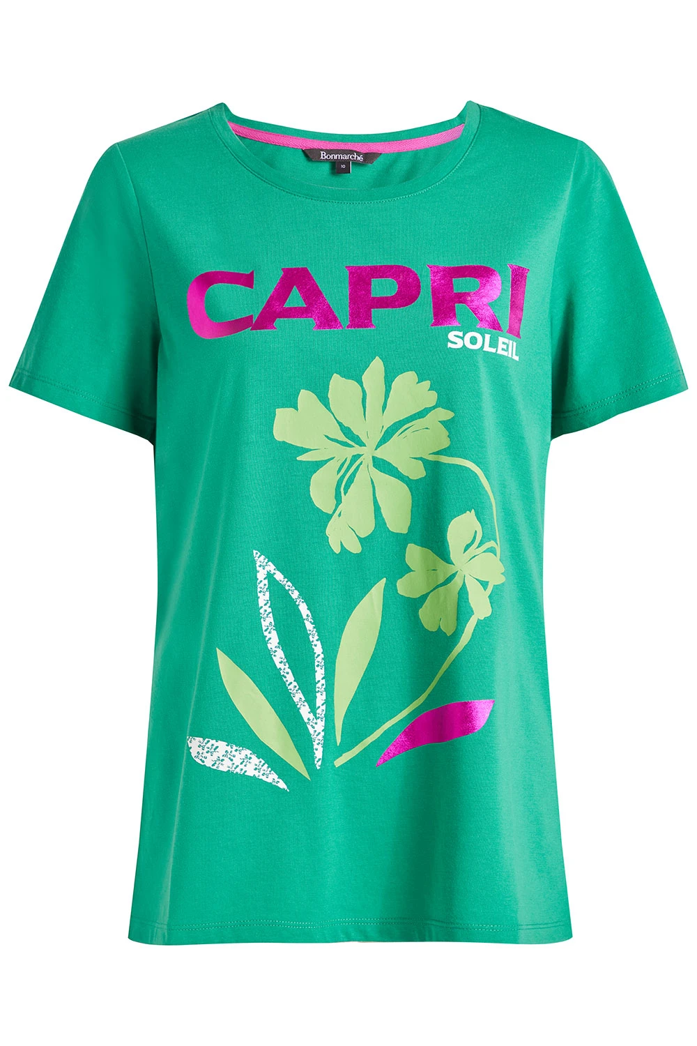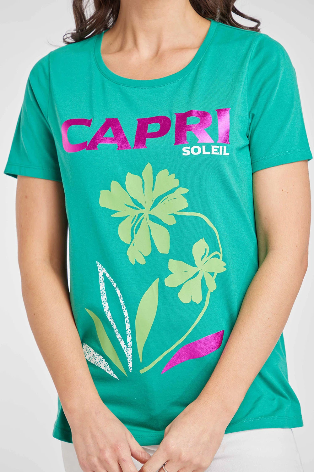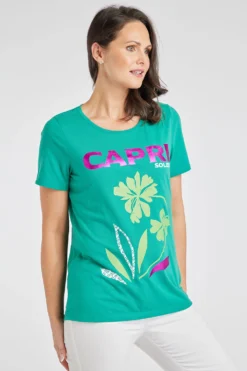 Add this short sleeve capri design top to your collection this Spring. The placement print and colour scheme make it perfect for a casual outfit at home. Pair with shorts and sandals for a great Summer look.