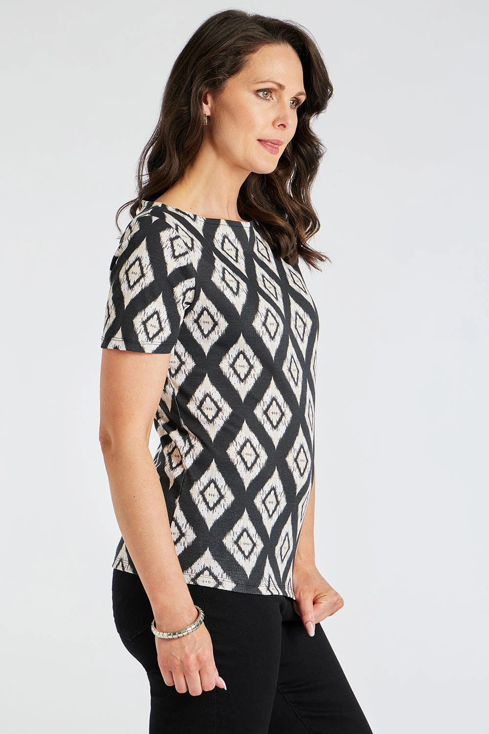 Add this diamond print top to your collection this Spring. The stand out print paired with the soft cotton fabric makes this a comfortable and breathable item. Style with trousers and heeled shoes for a great office look.