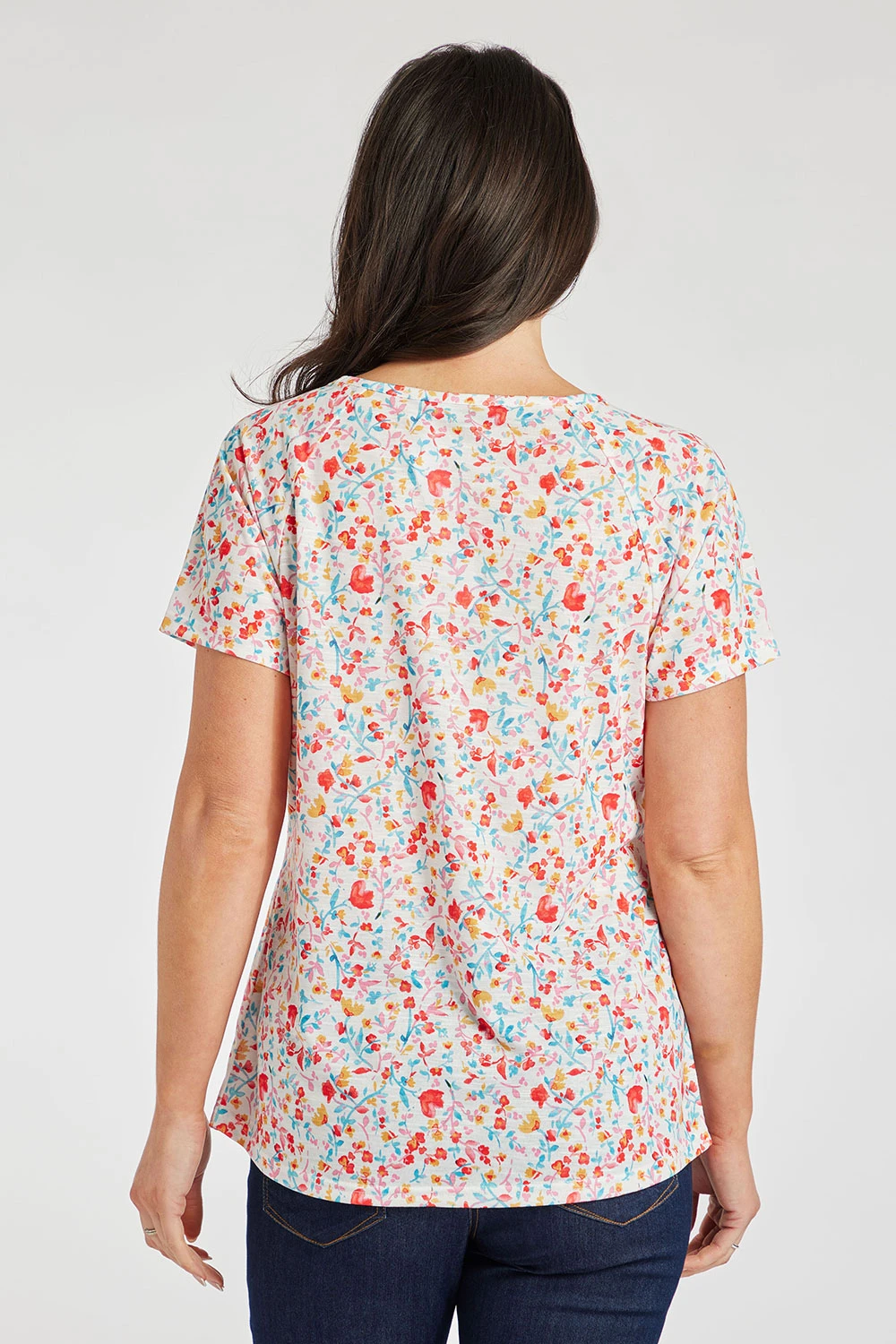 This ditsy print t-shirt is a great twist on a classic. Complete with a shirred neckline and a beautifully designed ditsy print, make this a season must-have. Wear with jeans or shorts for a great casual Summer look.