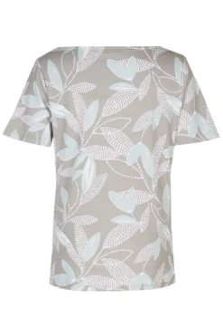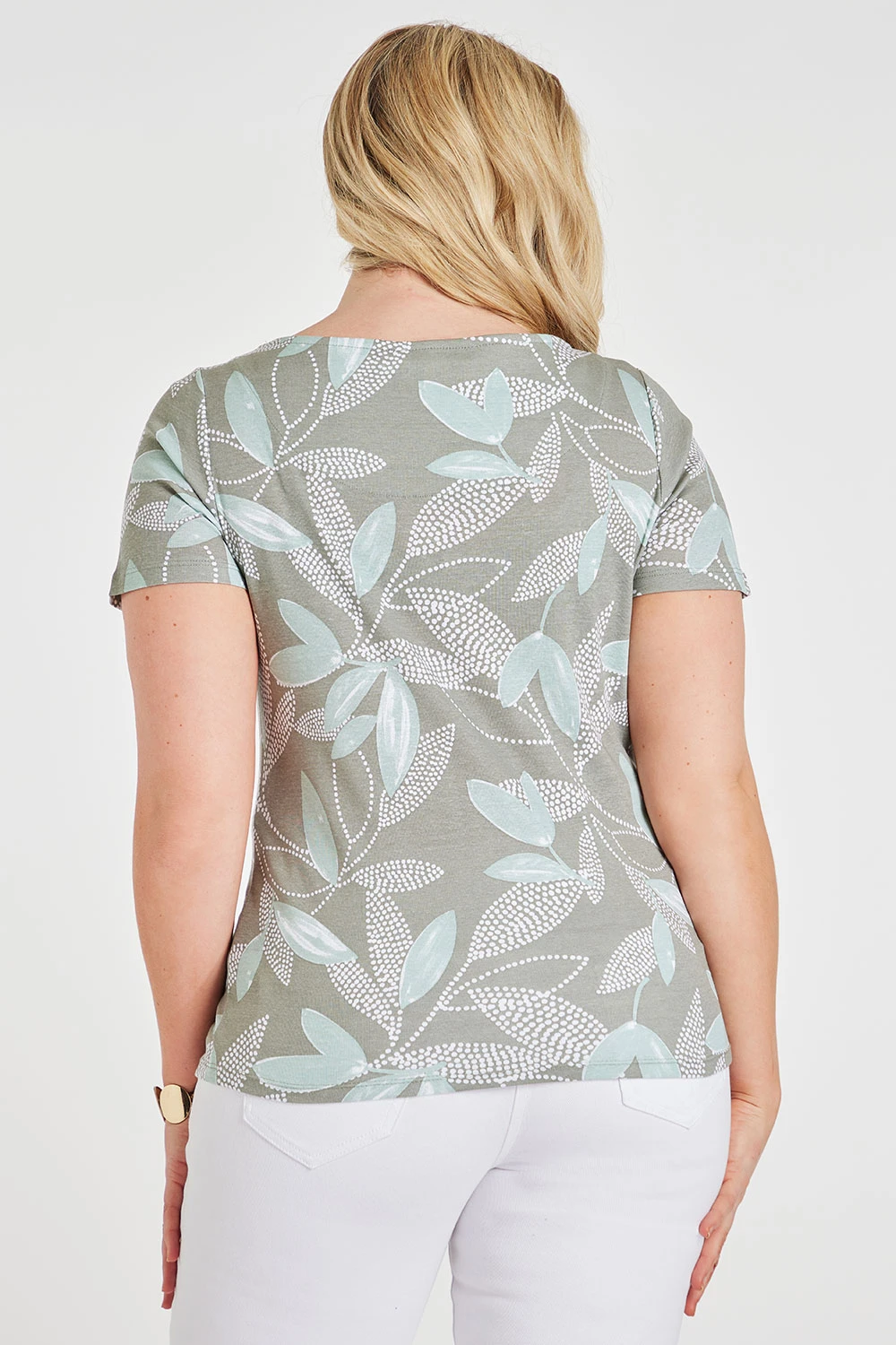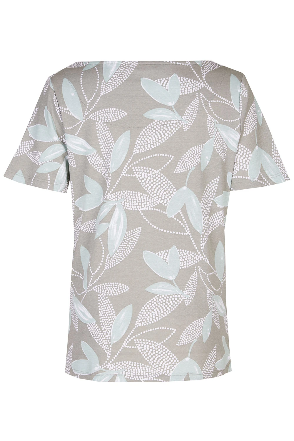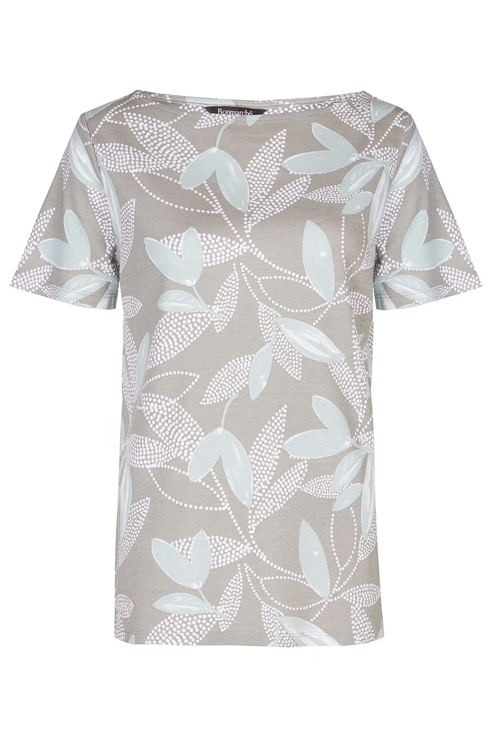 This short sleeve top is perfect for springtime. The leaves and dot print make it feel like spring and warmth. Complete with short sleeves and a boat neckline to make it breathable and comfortable. Pair with your favourite jeans and trainers for a casual look.