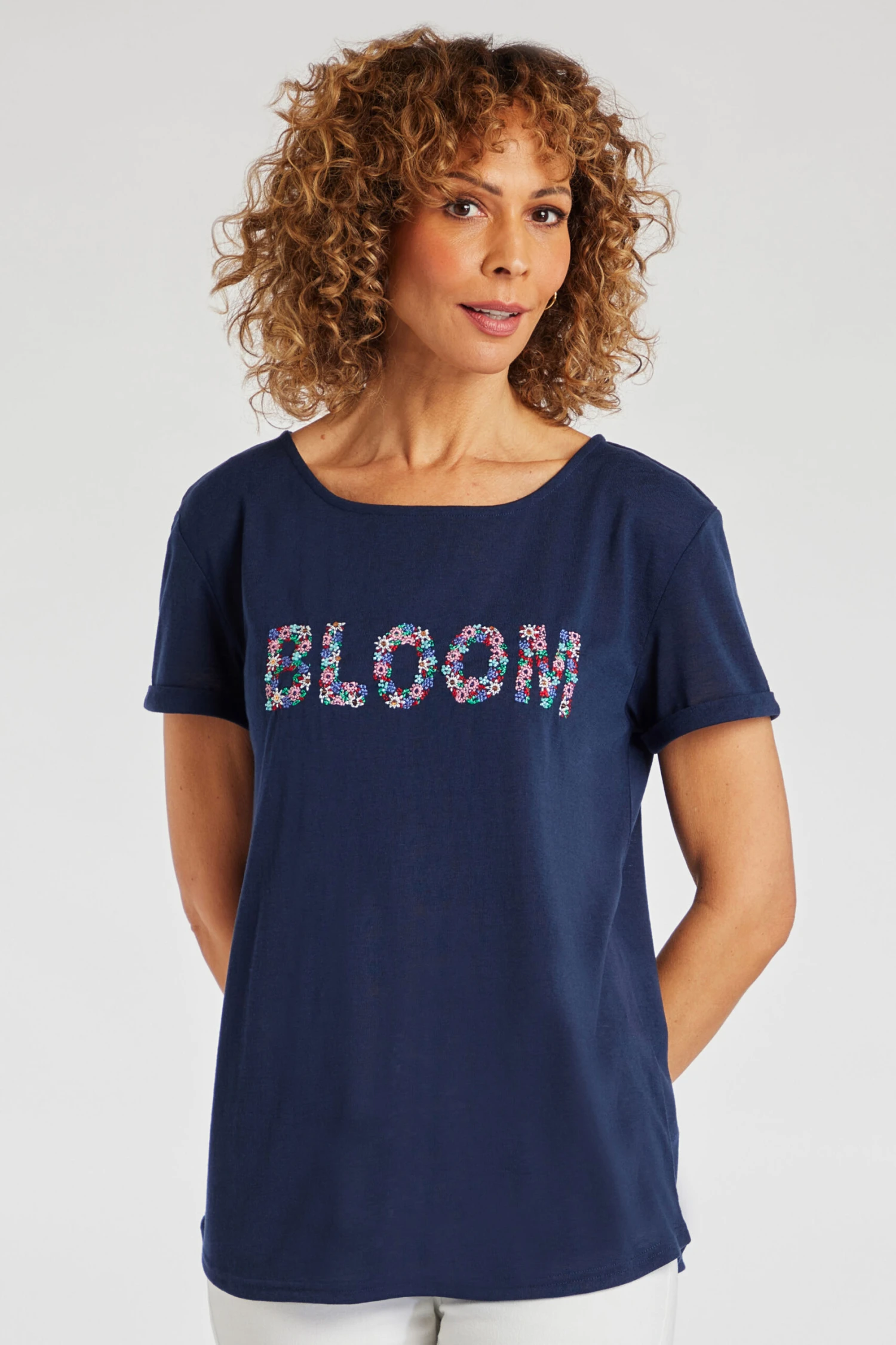 This beautifully designed ‘bloom’ embroidered t-shirt is perfect for the Spring/Summer season. The delicate flower embroidery and colour scheme add a feminine touch to a classic style of t-shirt. Wear with jeans and trainers for a great casual look.