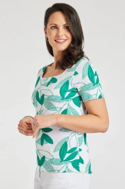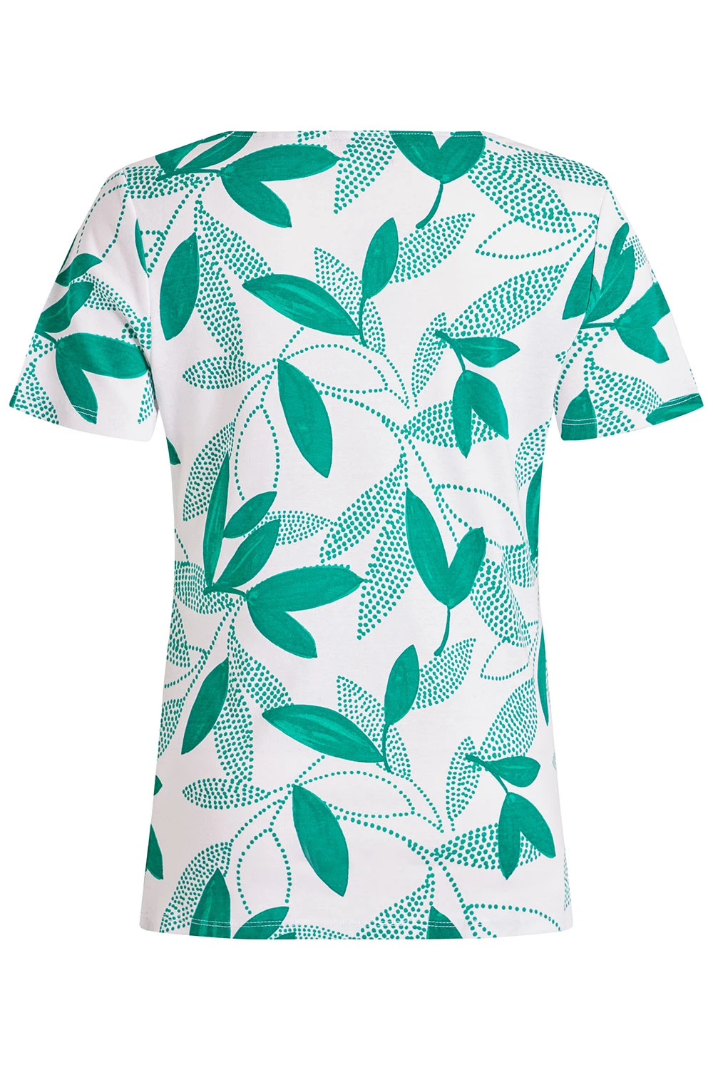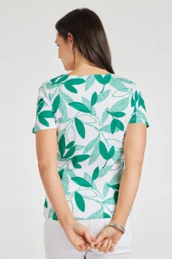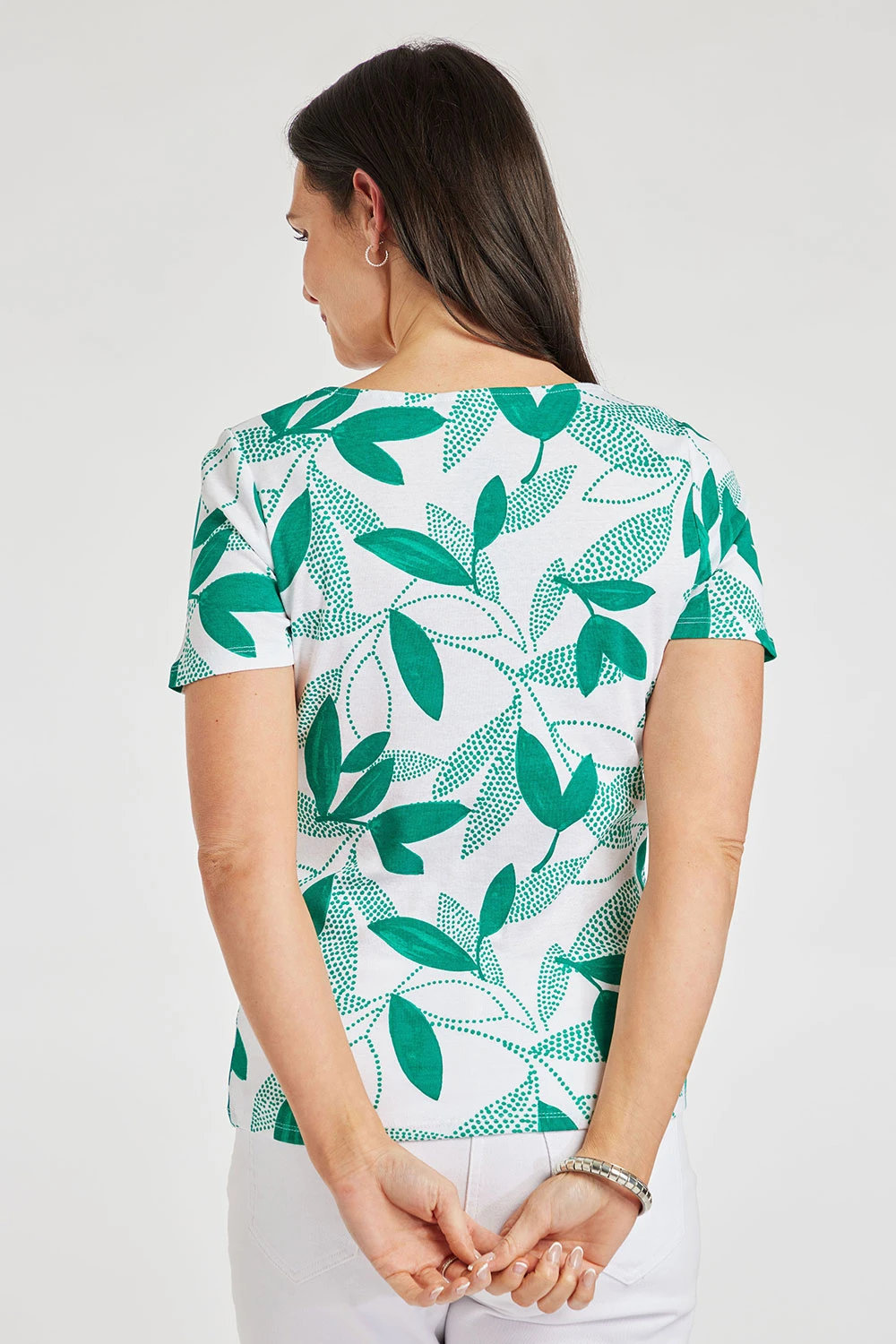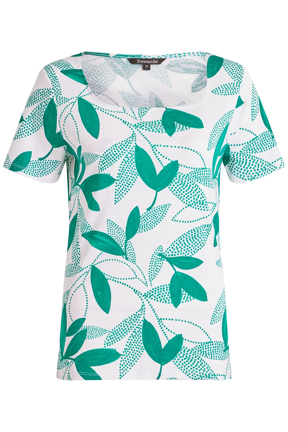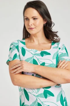 This short sleeve top is perfect for springtime. The green leaves and dot print make it feel like spring and warmth. Complete with short sleeves and a square neckline to make it breathable and comfortable. Pair with your favourite jeans and trainers for a casual look.