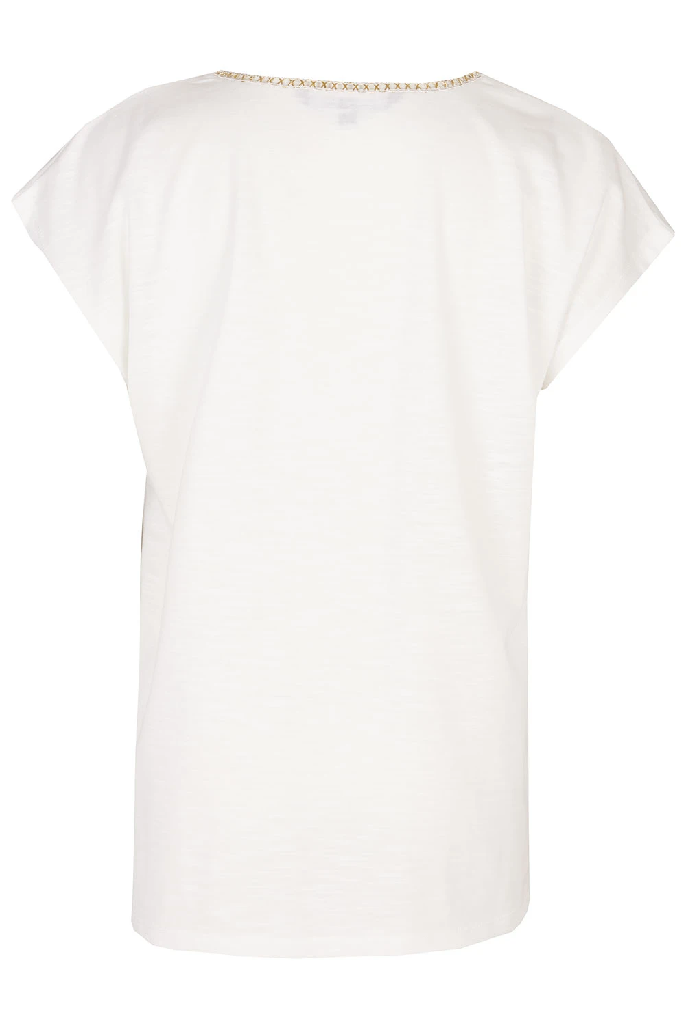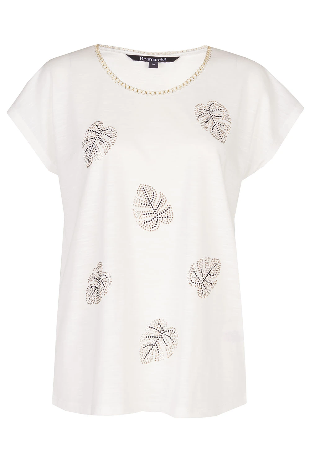 This leaf design top is perfect for the holiday season. The hotfix detailing for added sparkle and the leaf design makes it a must-have for your Summer wardrobe. Pair with linen trousers and wedge sandals for a great casual holiday look.